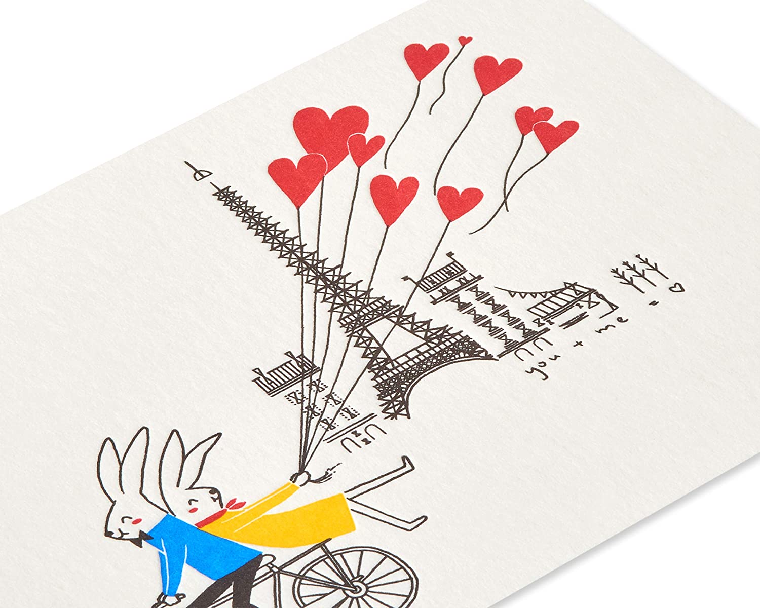 When two people find the perfect some bunny to love, it's always something to celebrate. Wish them a happy anniversary with this card from Papyrus. It features two bunnies riding a bike through Paris with a bouquet of balloons, and the Eifel Tower in the background. It's cute, it's sophisticated, it's a love meant-to-be. Whether you're celebrating a couple you know, or a love of your own, say oui to this letterpress card and viva l'amor! Red envelope and gold seal are included.