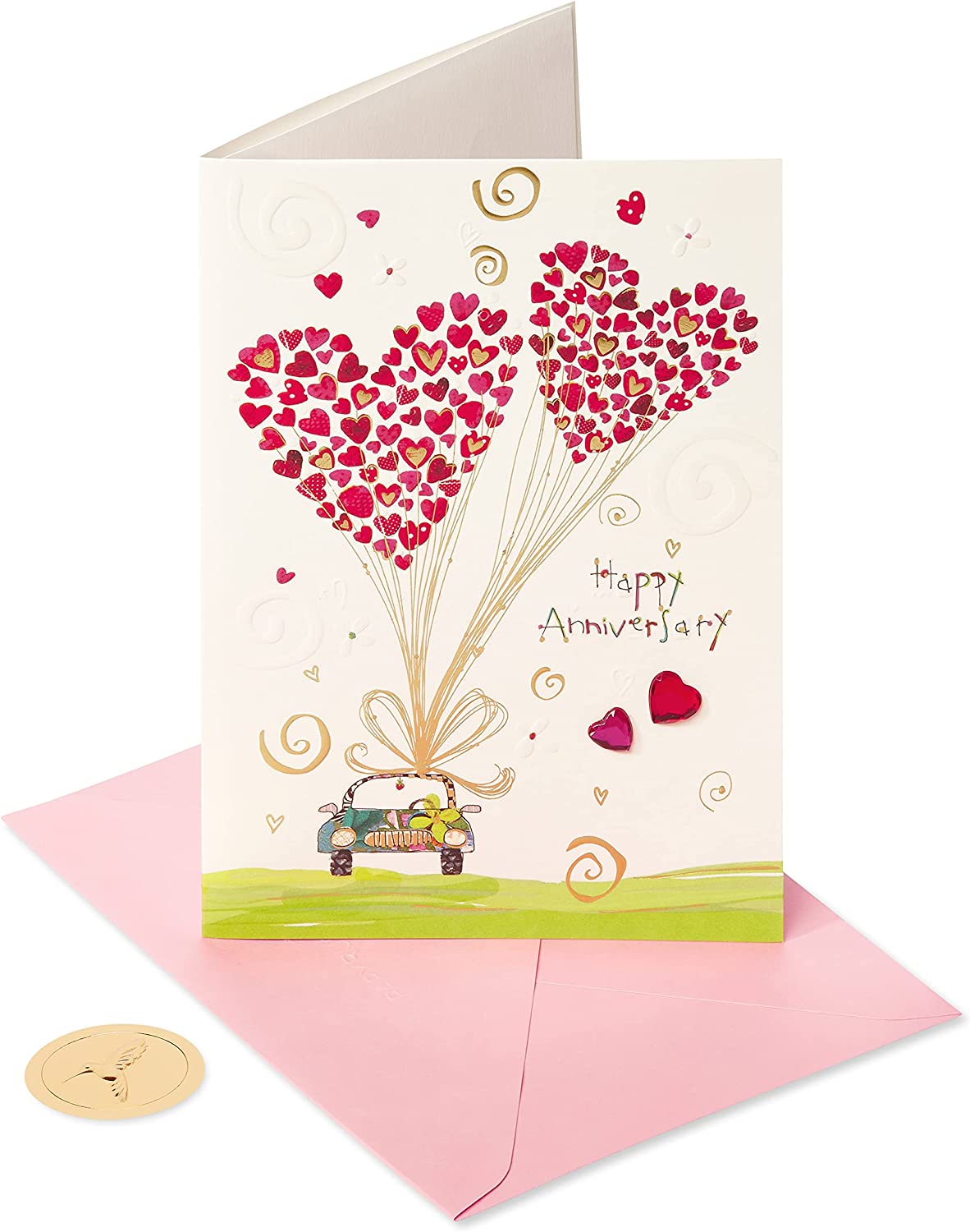 It takes a special couple to stay together year after year. Whether you are a part of that couple, or just lucky enough to know them, this Papyrus anniversary card is just the thing to mark the happy occasion. Part of the Turnowsky collection, this whimsical design features an illustration of a car on a hillside with ribbons and lots of heart-shaped balloons that cluster together to form two bigger hearts. With special touches like metallic foil, gems, and embossing, this Papyrus card is sure to bring smiles. Includes matching envelope and gold seal. Requires extra postage.