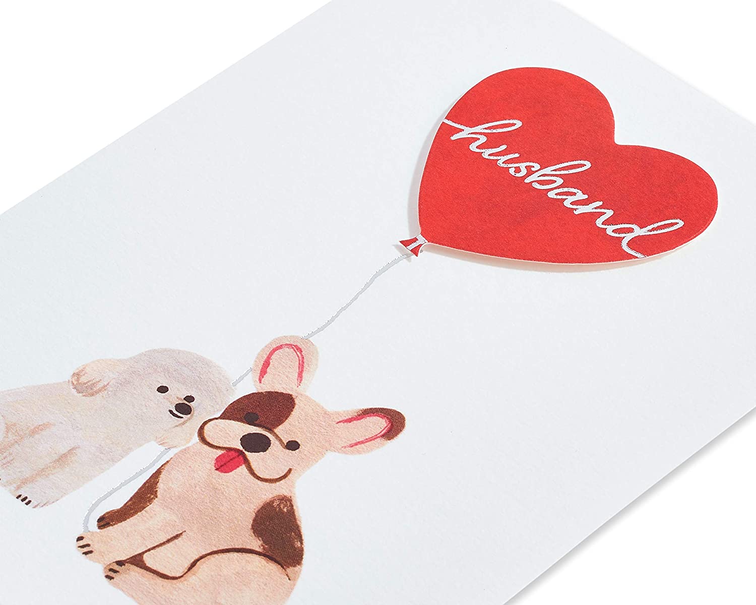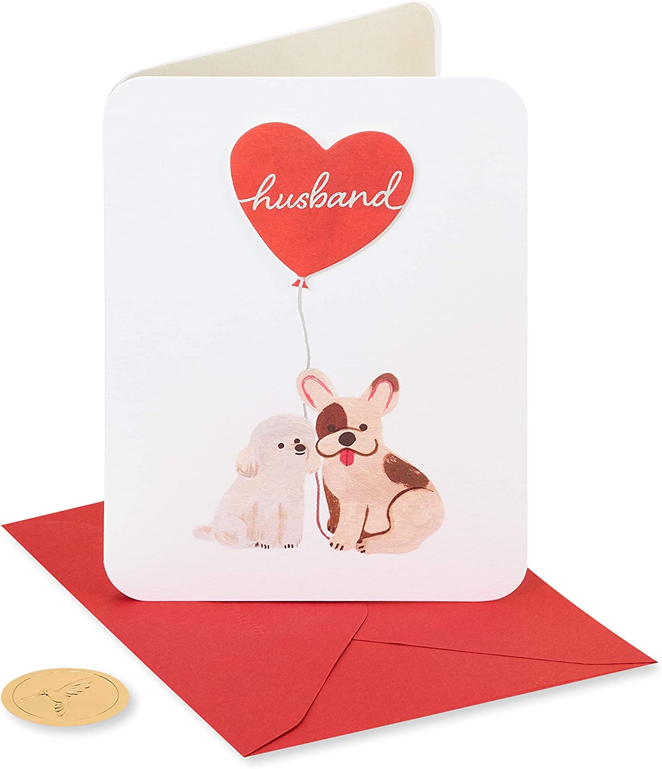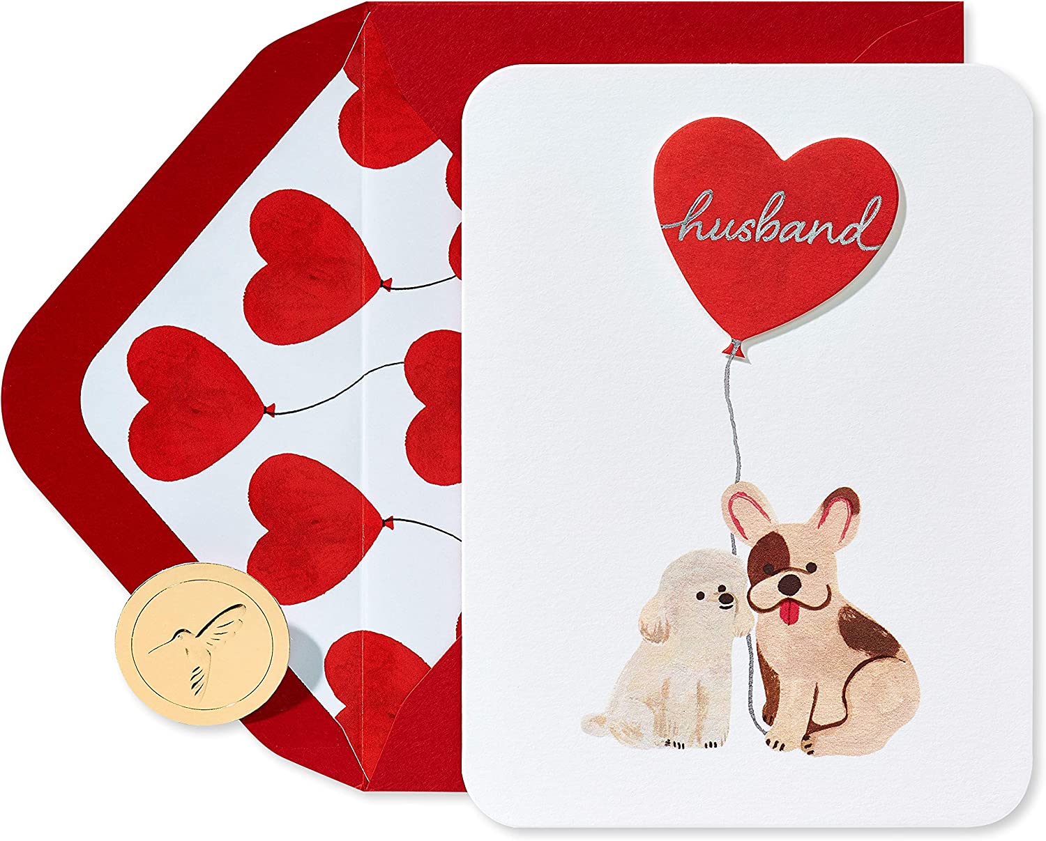 It's more than puppy love between the pair of pooches featured on this Husband Anniversary card from Papyrus, which includes embellishments such as foil, rounded corners, embossing, and layered paper attachments. The bright red envelope has a dynamic interior showing a pattern of heart-shaped balloons similar to the one in the card design. The Papyrus gold seal is also included.