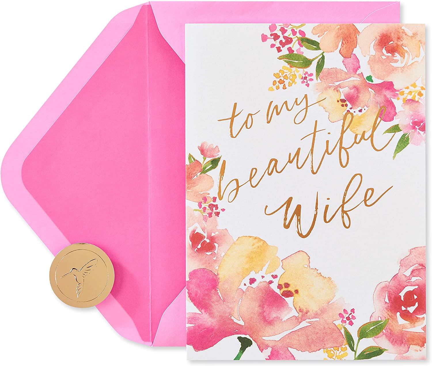 On your anniversary, give your beautiful wife this beautiful Papyrus card Let her know how much you treasure sharing life and love with her. The premium design features contemporary watercolor flowers in shades of peach and pink, with hand lettering in gold metallic foil. The deeply meaningful message inside will help you express your love and appreciation for her. She means the world to you - and your anniversary is the perfect time to remind her Pastel pink envelope with rich pink lining and unique Papyrus gold seal included.