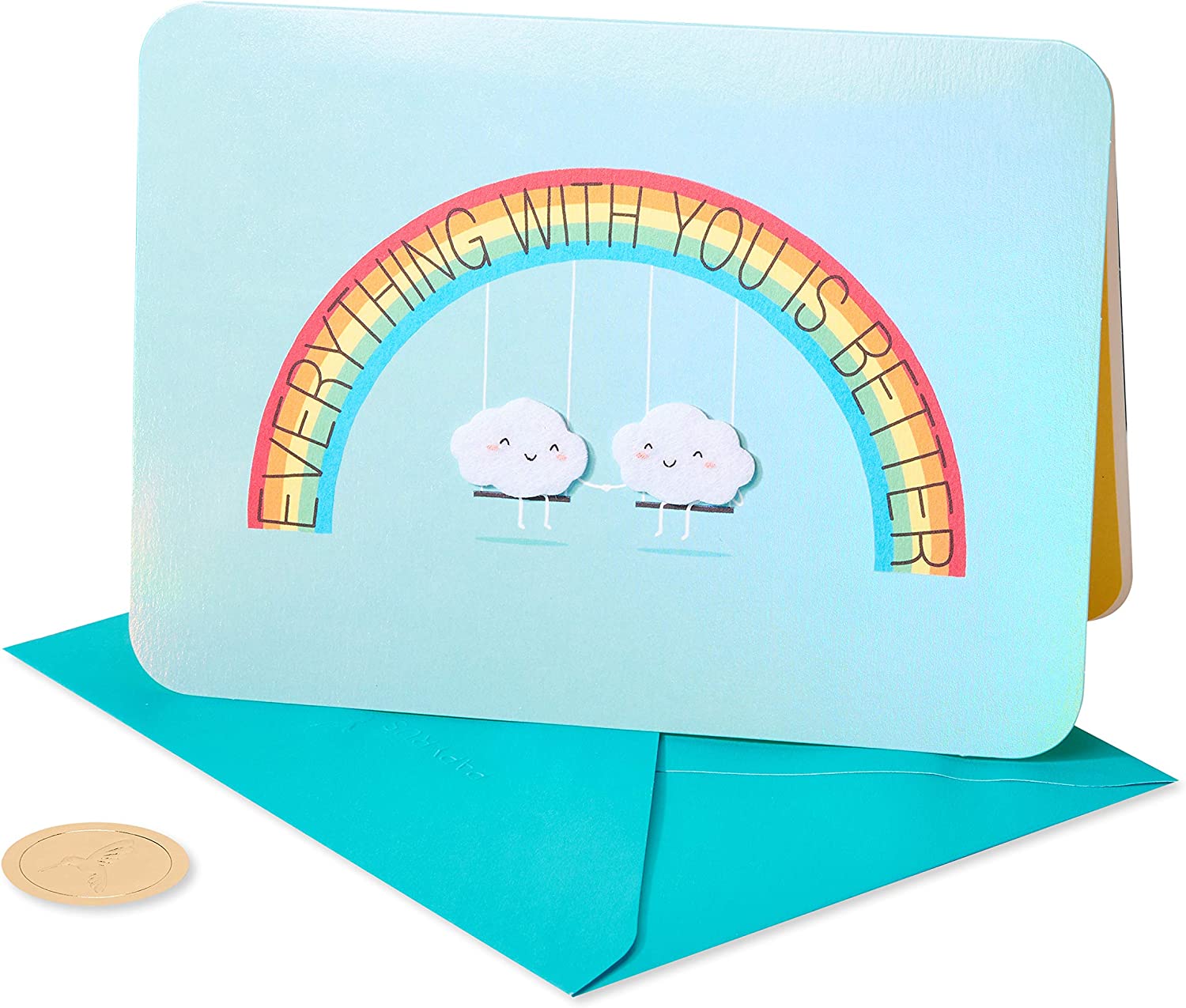 When you're in love, it's hard not to smile. The same can be said about this super-cute anniversary card from Papyrus. The design features two happy little clouds, swinging from a rainbow hand in hand, with nothing but blue skies and sunny vibes as far as Papyrus offers premium stationery, greetings cards, gift wrap, gift bags and entertaining products for everyday occasions and all holiday seasons--all with unique designs and quality embellishments.