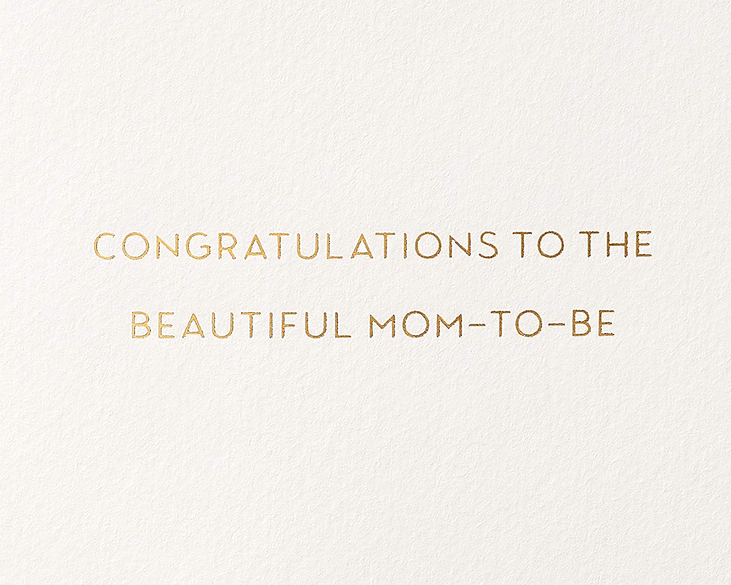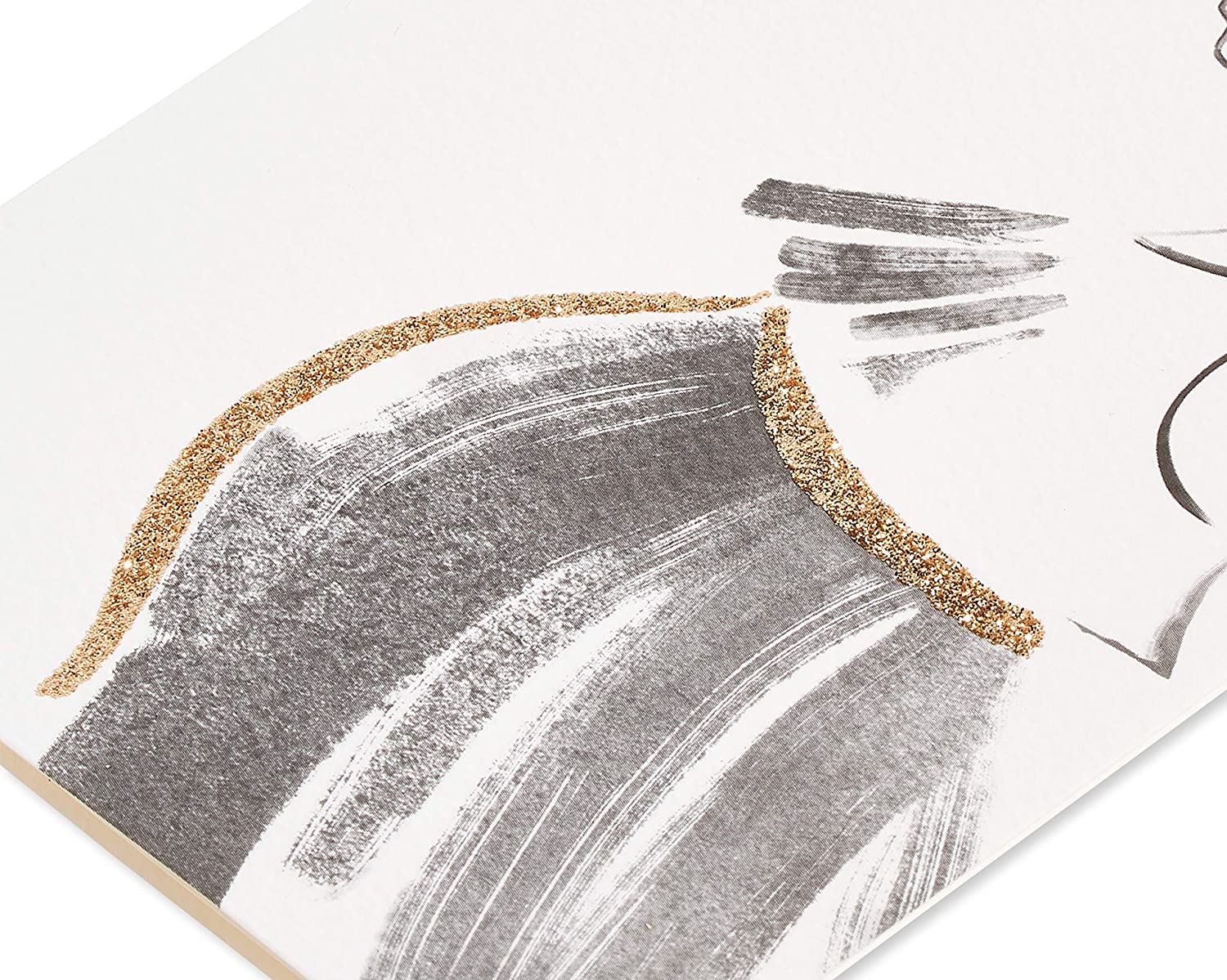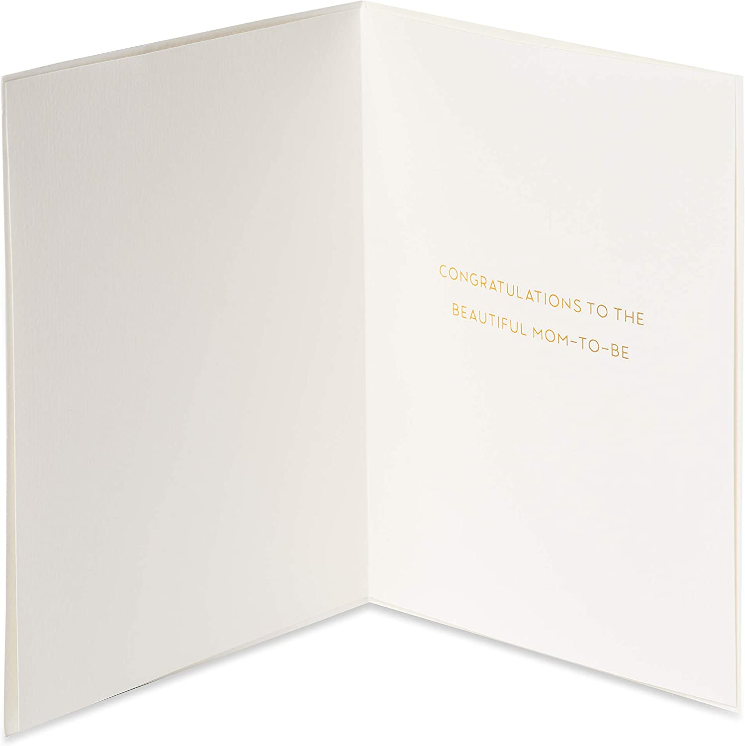 Let a mom-to-be know you share her excitement with this understated but lovely design in loose, watercolor brush strokes that shows a woman and her beautiful baby bump! This premium card from Papyrus features glitter and gems for added sparkle and a message of congratulations in gold lettering on the inside. An elegant pastel peach envelope with a light brown lining is included, as is the signature Papyrus gold seal.