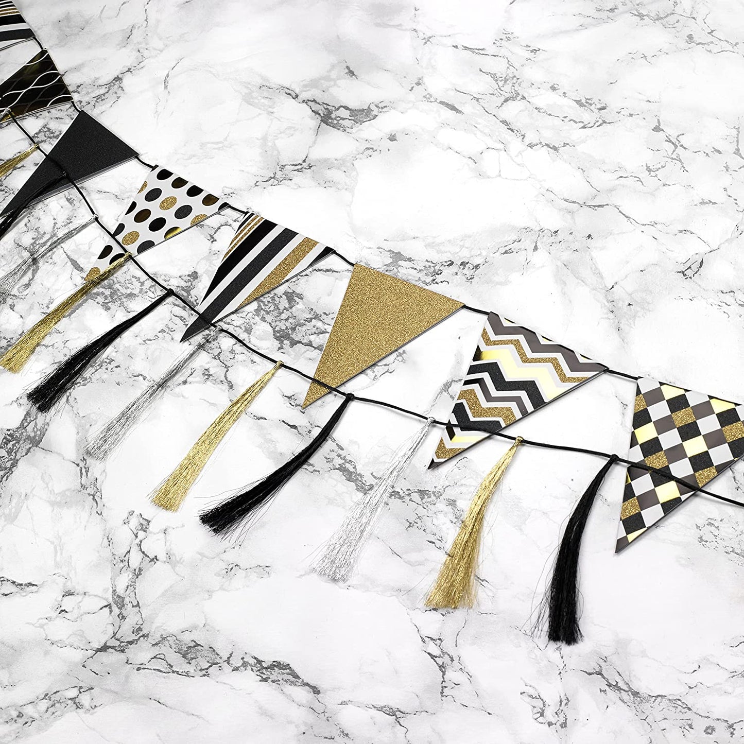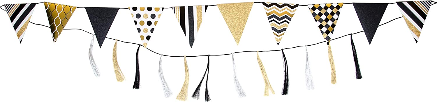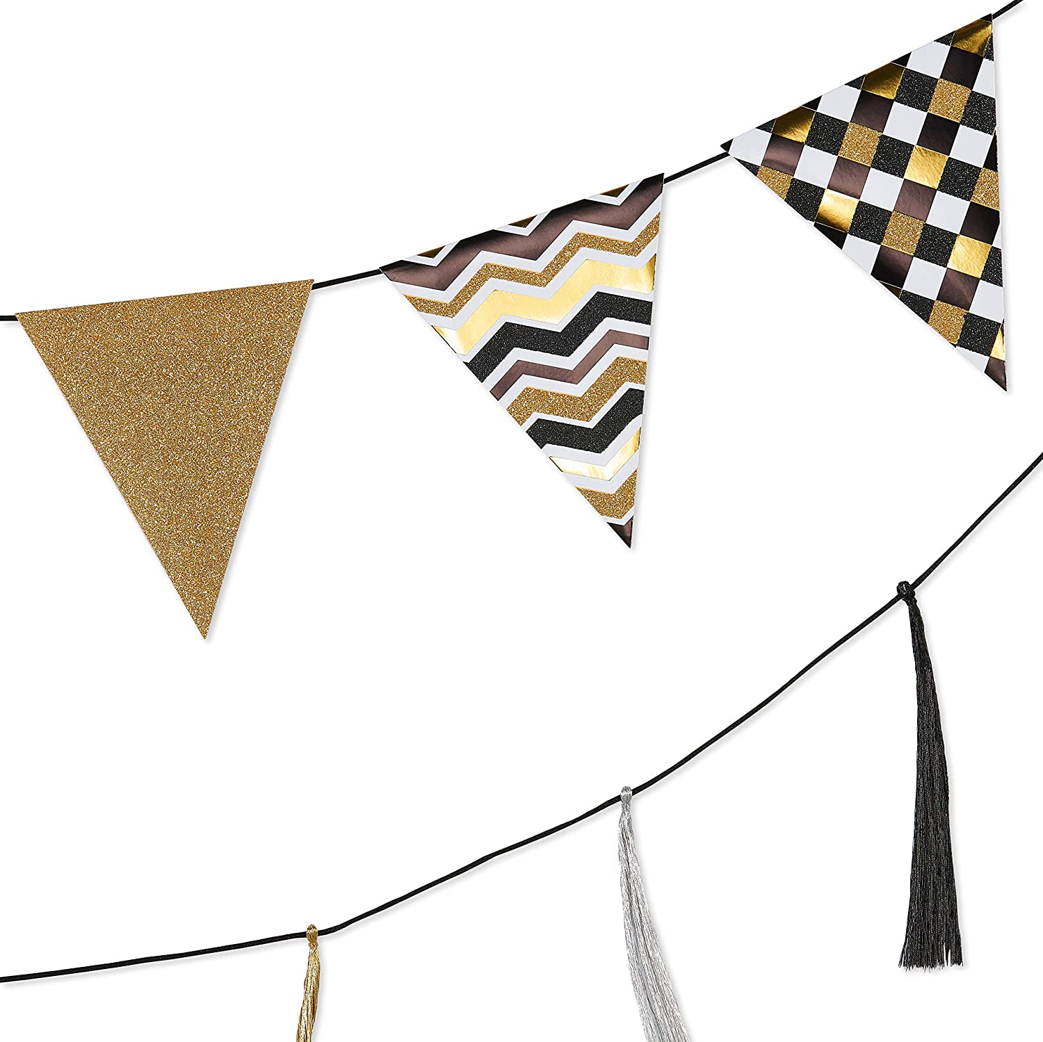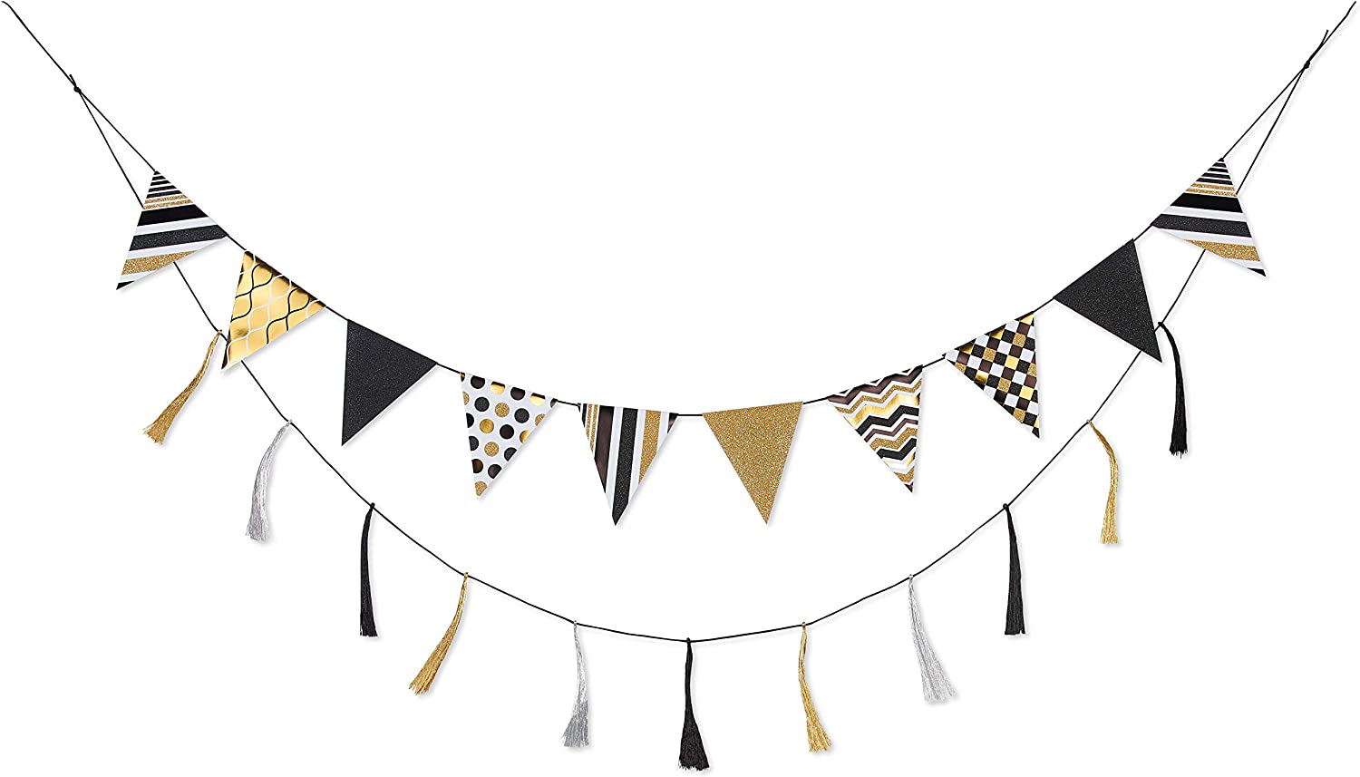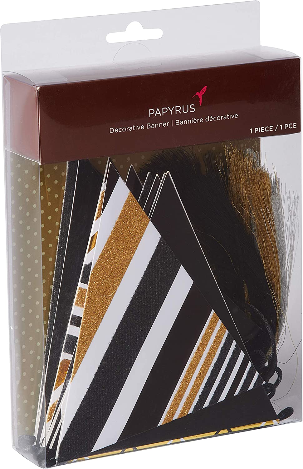 Add a trendy touch to your celebration with this fabulous banner from Papyrus. Pennants with black and gold patterns hang alongside shimmery tassels. Coordinates with the Black & Gold Rush collection.