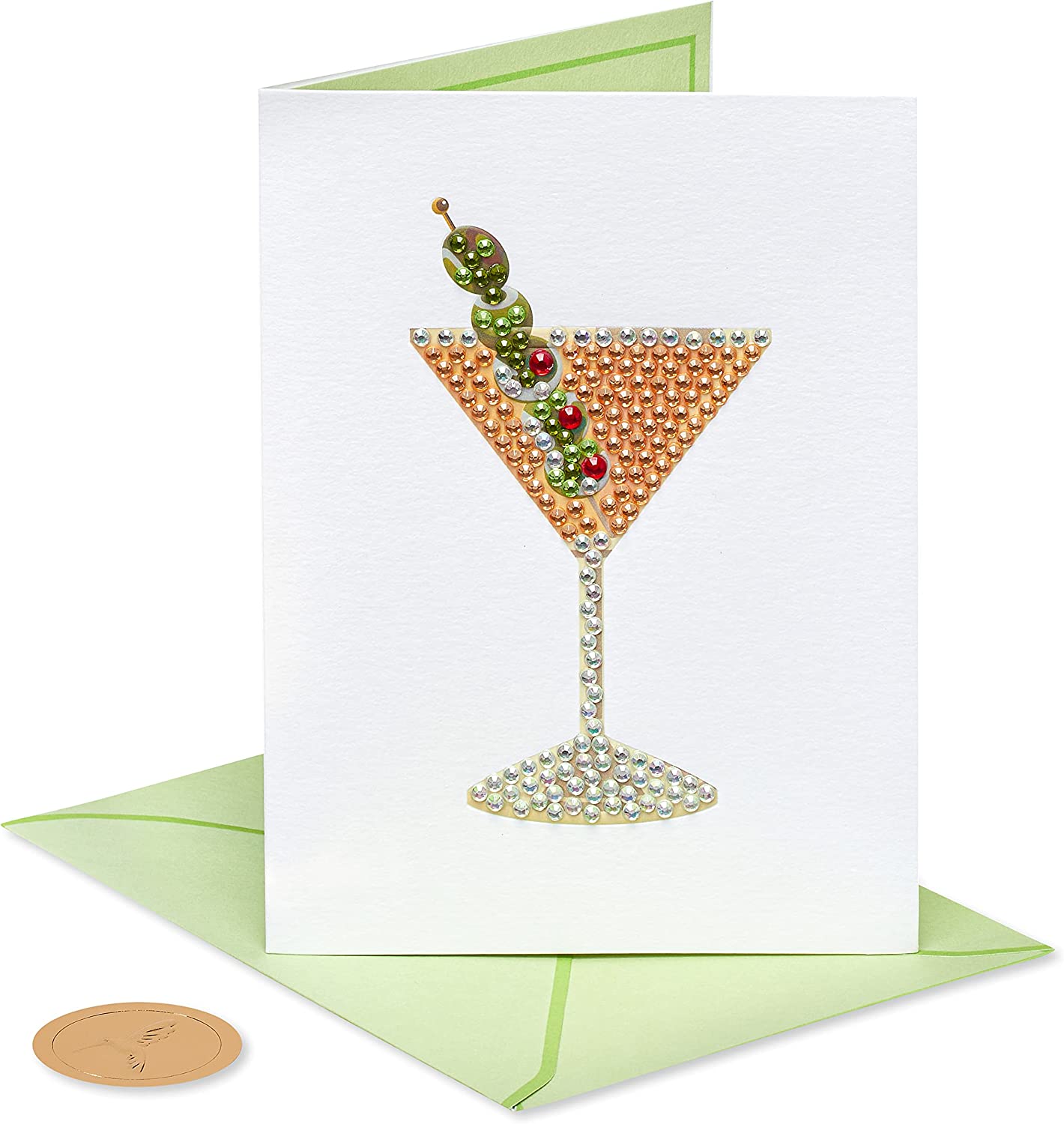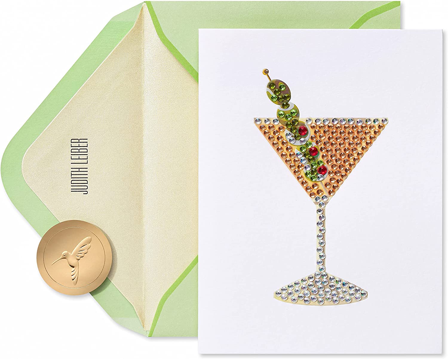 Say happy birthday in a memorable way with this fun and eye-catching martini card from Papyrus! Inspired by the artistry of iconic handbag designer Judith Leiber, this beautiful Papyrus card includes a delightful gem-covered drink highlighted by gorgeous green olives. Embossing and foil embellishments provide added sparkle and style, while the brief inside message allows for plenty of space to add your own personal thoughts. The lucky birthday person will feel like the toast of the town when they see this premium Judith Leiber card. A special envelope and the unique Papyrus gold seal are included. Extra postage is required.