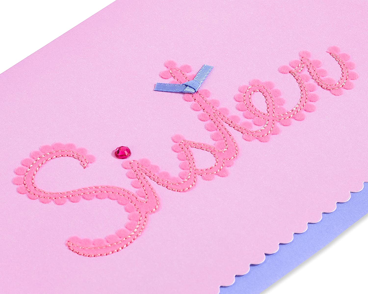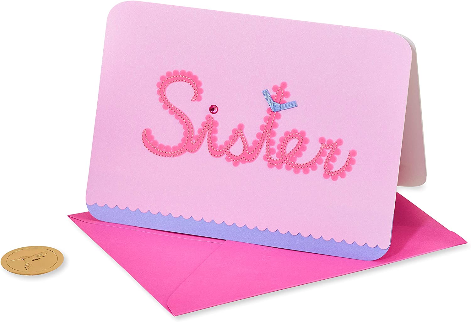 Amazing sisters deserve amazing cards! This fun, handcrafted card from Papyrus shows "Sister" spelled out in embroidered pink script embellished by a cute gem that dots the "i" and a sweet little bow that crosses the "t." Rounded corners add style and a simple-but-heartfelt inside message allows for plenty of room to add your own thoughts. A hot pink envelope with a purple lining completes the cool look, and the Papyrus gold seal is included.