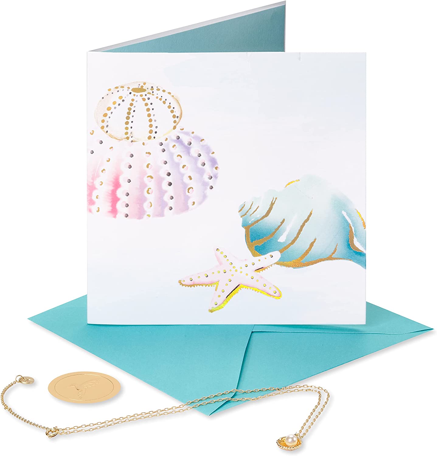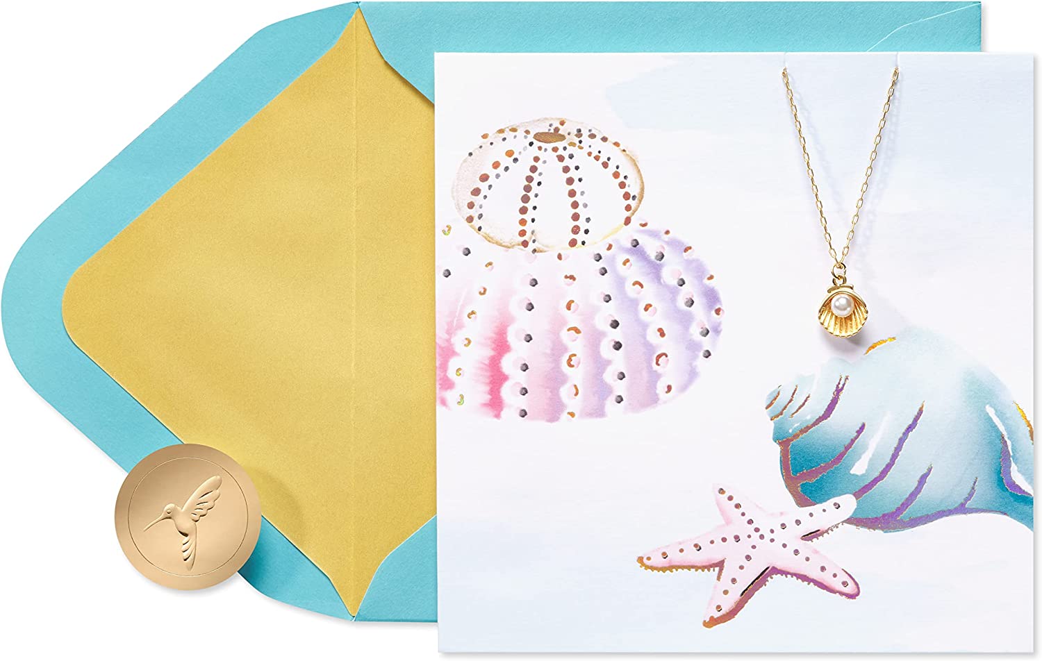Make the occasion even more special when you give a Papyrus card paired with our beautifully crafted jewelry. This stunning collection features the gorgeous artwork of Mateja Kovac accented with a charming necklace. The unique combination of style and art is the perfect gift for any celebration. Add the beauty of the beach to their jewelry collection with this dazzling Seashell Necklace by Papyrus. This premium necklace features a dainty shell pendant with a stunning iridescent pearl nestled in the center on a beautiful gold chain. Necklace is 16" long with a 3" adjustable extender. Jewelry by Papyrus necklace has a faux pearl detail accents, which is the perfect Papyrus signature touch. On the necklace enclosure, we've included a tag with our embossed hummingbird logo along with a mini gem. This premium Jewelry by Papyrus card is perfect to give as a gift, or purchase to wear and enjoy yourself! Includes a premium aqua envelope with gold lining and unique Papyrus gold seal. Extra postage may be required. Only from Papyrus.