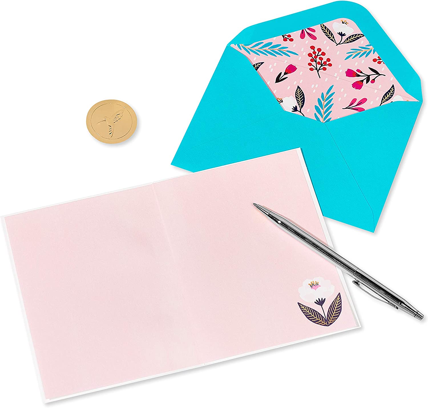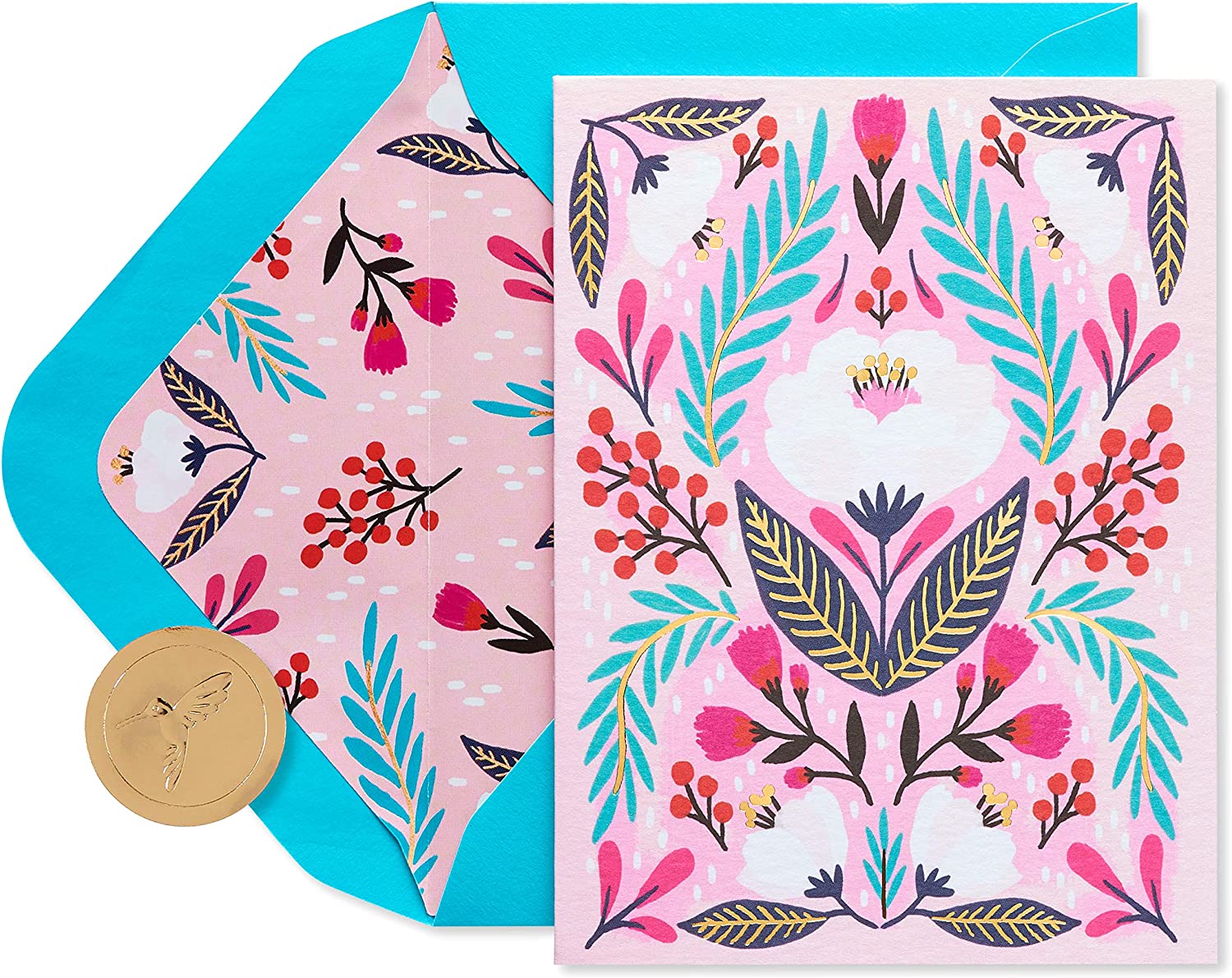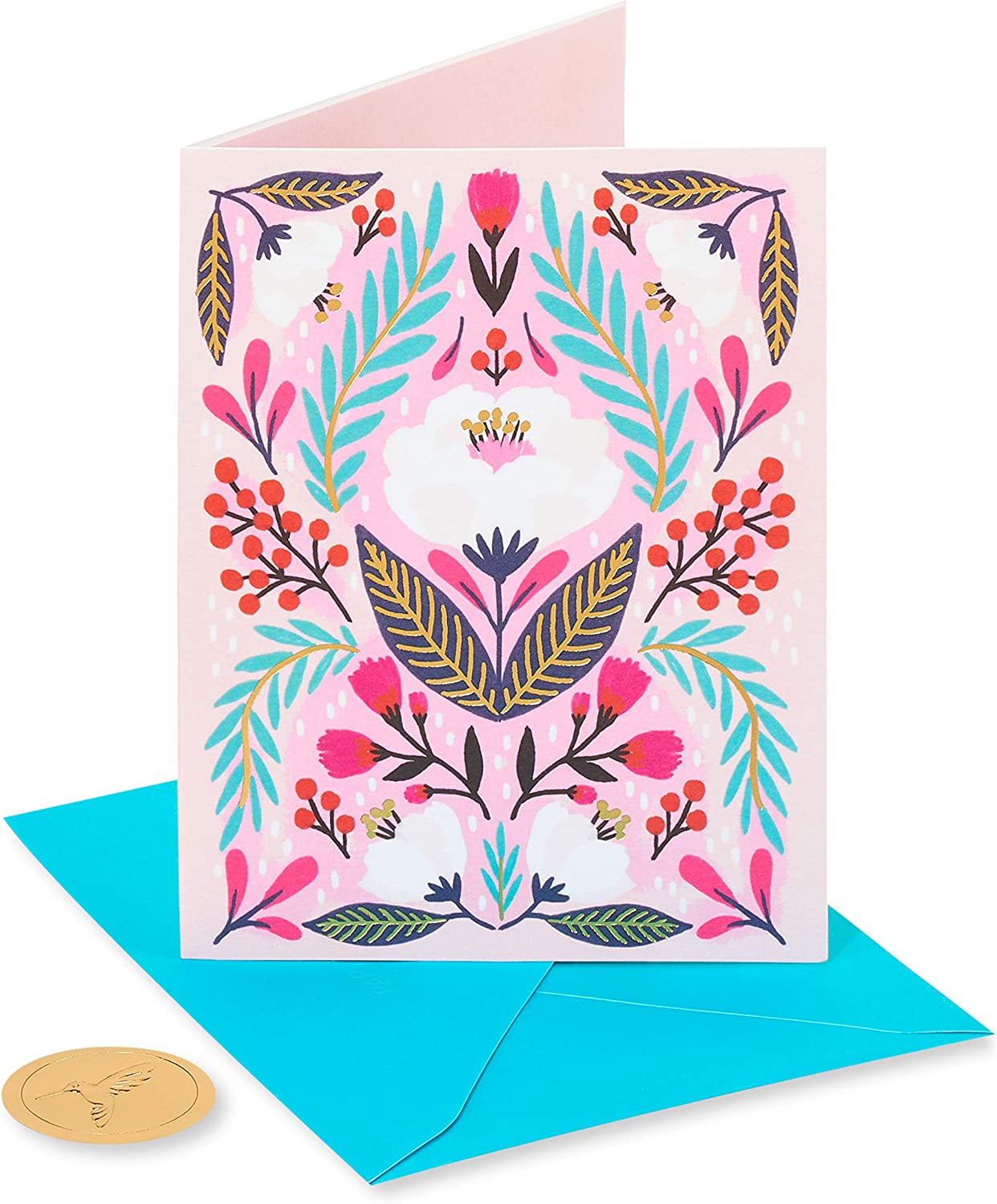 Share this stunning and irresistible floral design from Papyrus for birthday, thank you, congrats, thinking of you, or anytime! Modern design, yet feels timeless with its Eastern-inspired symmetry and contemporary palette of pink, aqua, and brown with metallic gold foil accents. So unique! Card is blank inside for your personal message. Premium paper. Includes aqua envelope with floral-patterned lining and unique Papyrus gold seal.