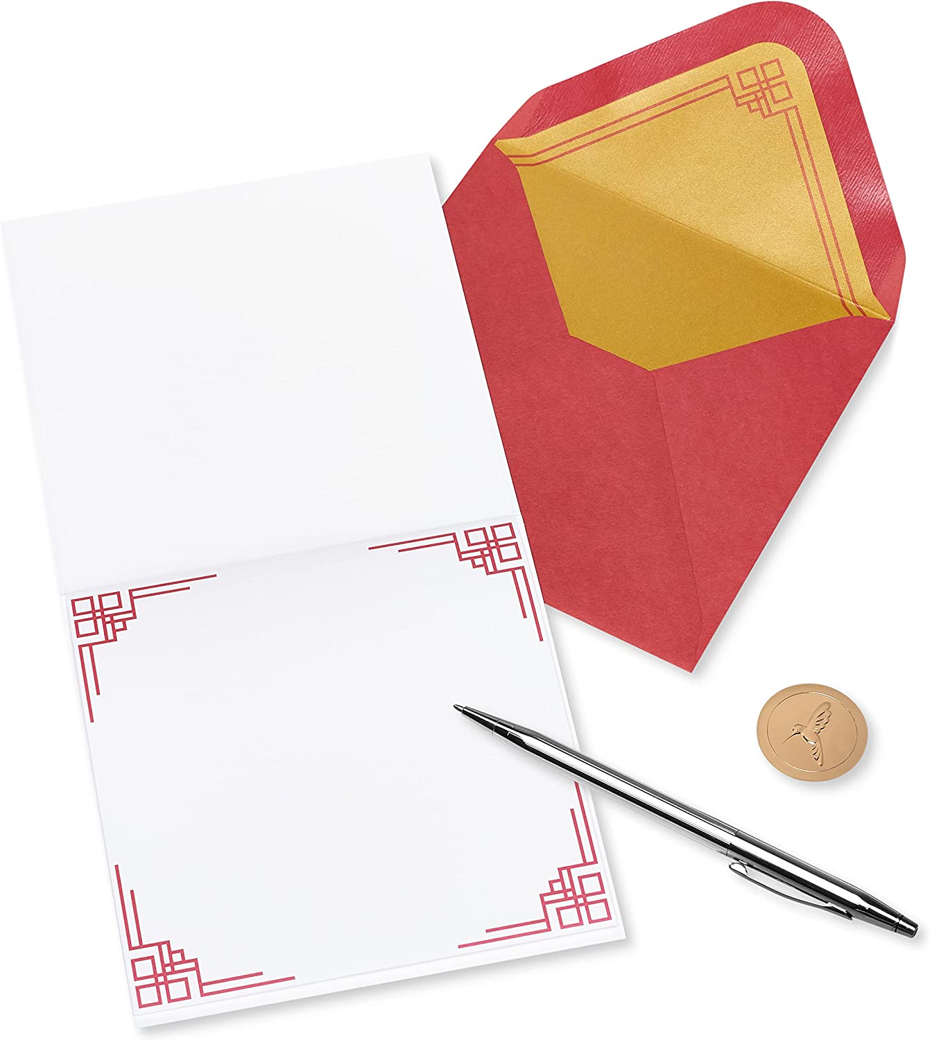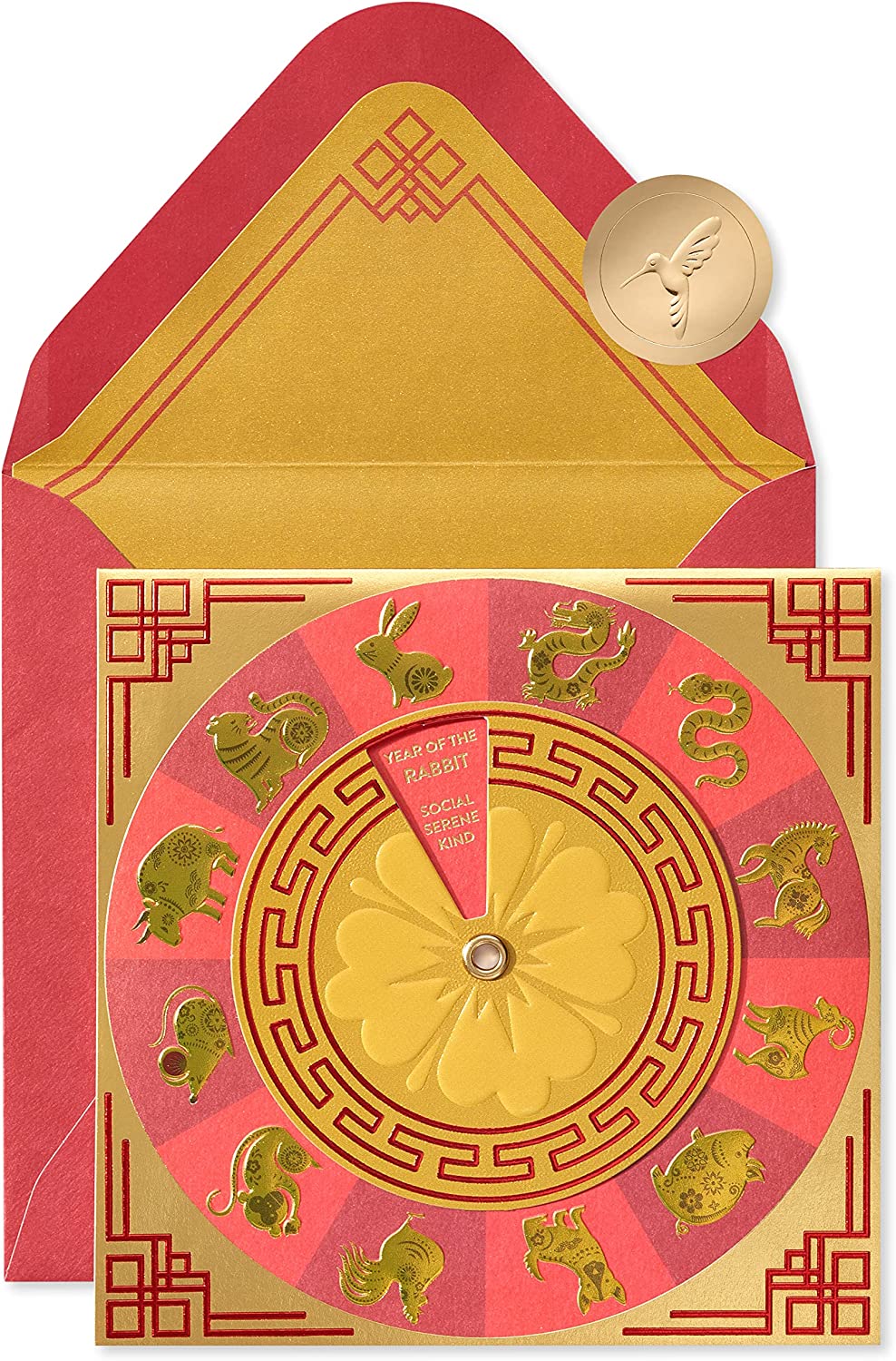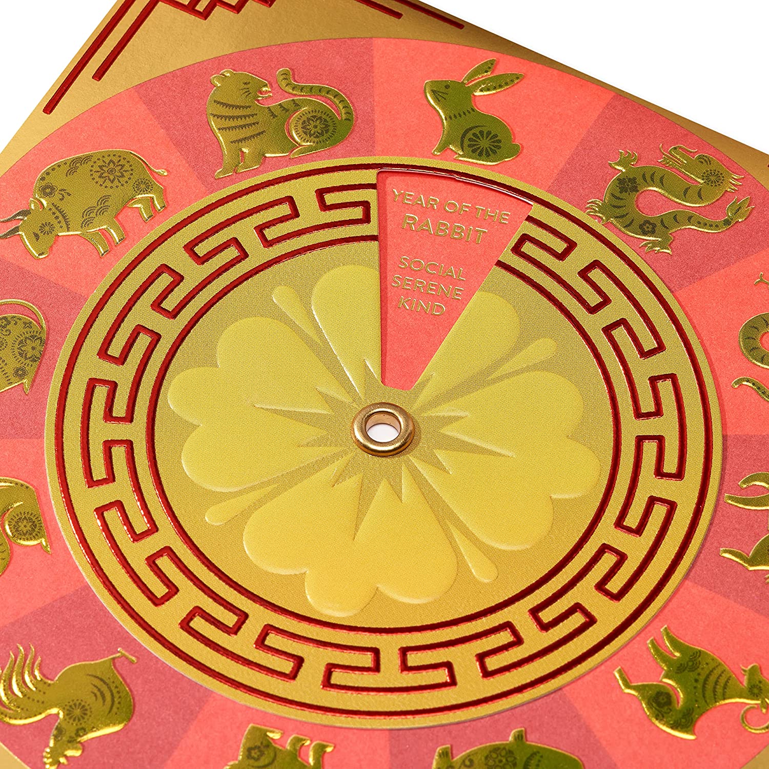 Celebrate Chinese New Year with this premium interactive Zodiac Spinner card, only from Papyrus! Spin the interactive dial to learn about the twelve different signs of the Chinese Zodiac. The spinner rotates to each animal of the Chinese Zodiac, and a die-cut panel reveals the unique personality traits associated with each sign. Layered paper attachments and metallic gold foil embellish this striking design. Card is blank inside for your personal message. Includes a premium gold envelope with beautiful red detail and lining, along with a unique Papyrus gold seal. Extra postage required. Only from Papyrus.