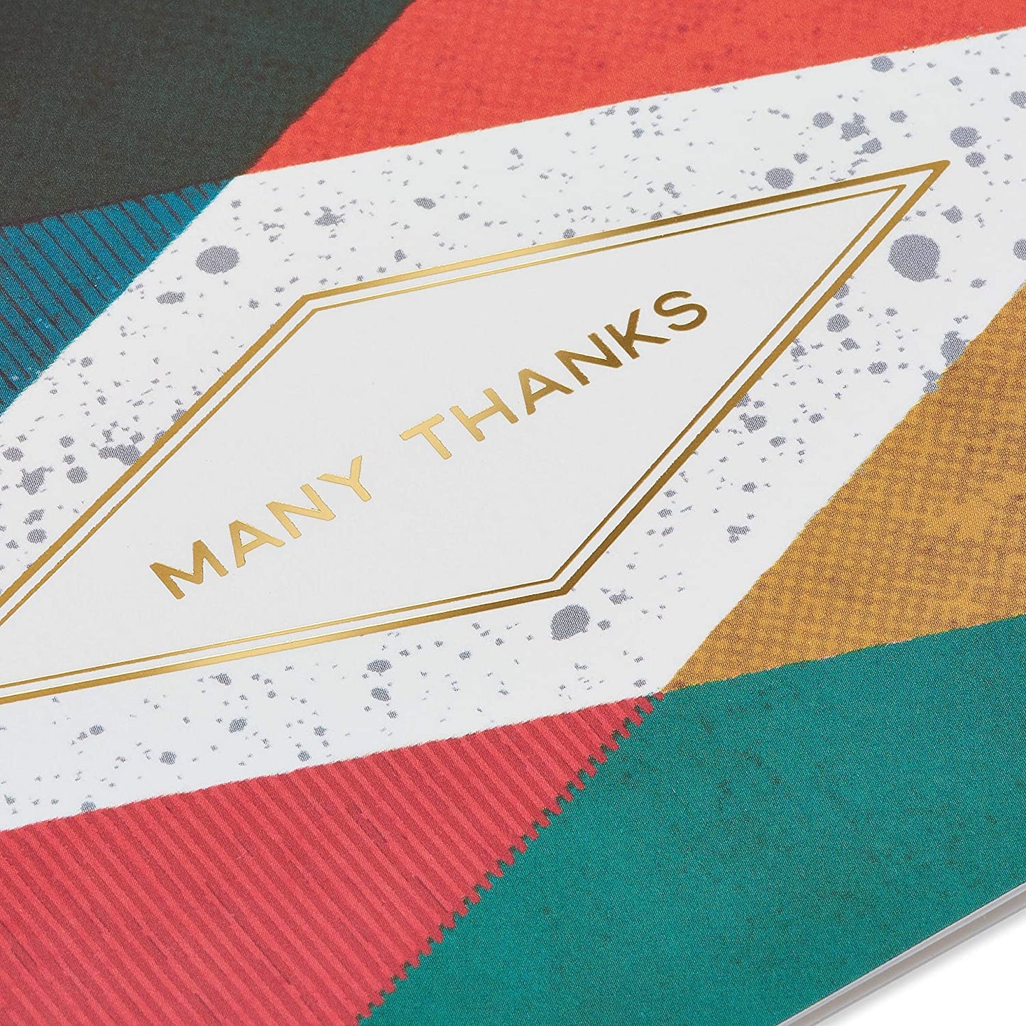 Say thank you in style with this sophisticated design displaying a geometric motif embellished with shimmering foil. A palette of red, turqouise, blue and black, with a "spattered paint" pattern is retro chic! The blank inside provides ample room to write your message, and the card is complemented by a white envelope with a colorful interior that repeats the eye-catching pattern featured on the card. A gold seal is included and extra postage is required.