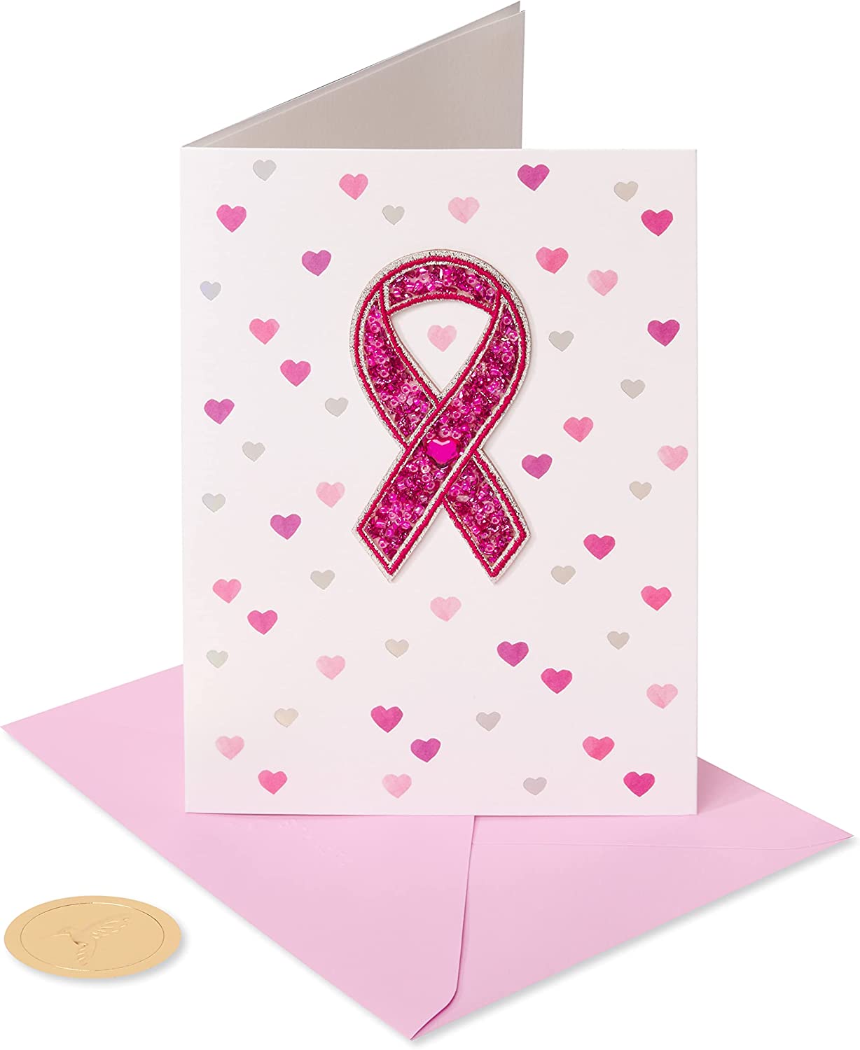Honor those struggling with breast cancer with this premium Thinking of You card from Papyrus. In partnership with the Breast Cancer Research Foundation, Papyrus will donate a percentage of each card purchased to breast cancer research. Design features a removable pink ribbon patch of the iconic symbol set against a background of pink, purple, and blue hearts. This beautiful design is enhanced with metallic foil, gems, and beads. The inside is left blank so you can write your own personal, heartfelt message. You're sure to help them feel supported and cared about with this thoughtful card. Includes premium heart-lined pink envelope and the unique Papyrus gold seal. Extra postage required.
