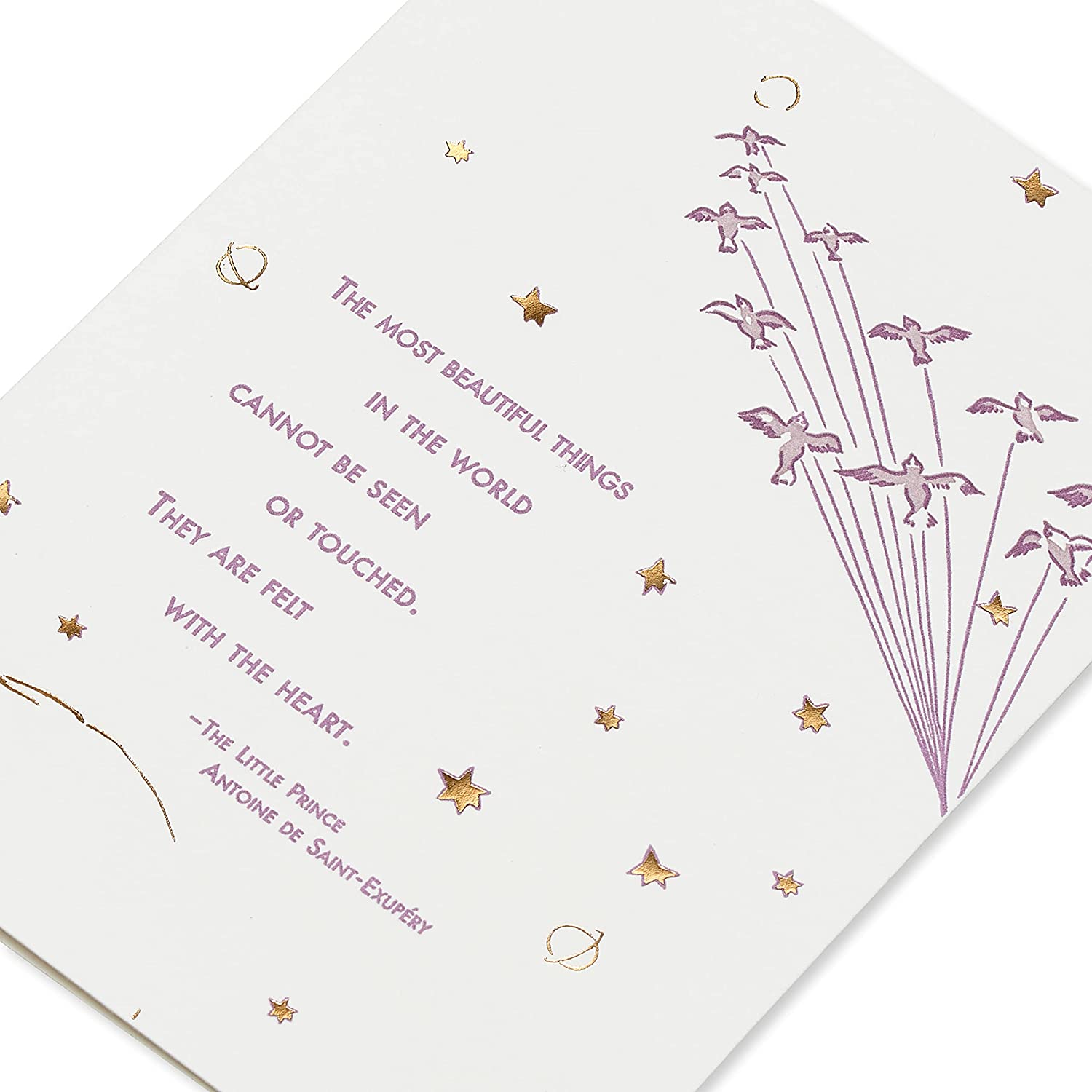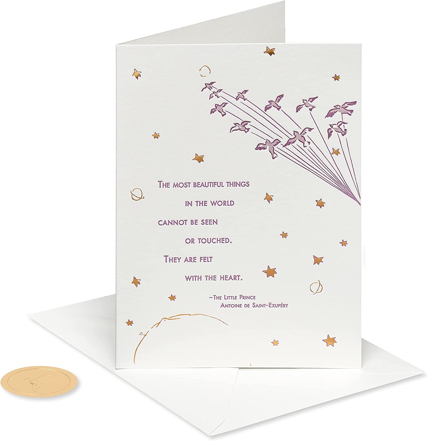 Let them know they're on your mind with this beautiful card from Papyrus. The front of this card features a heartfelt quote from the classic novel, "The Little Prince," as well as sweet depictions of stars, birds, and planets with metallic foil and letterpress embellishments. It's blank inside, so there's more than enough room for your own personal message. Give it to anyone for any occasion. Envelope and gold foil seal are included.