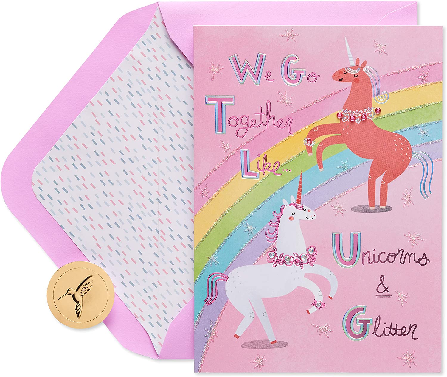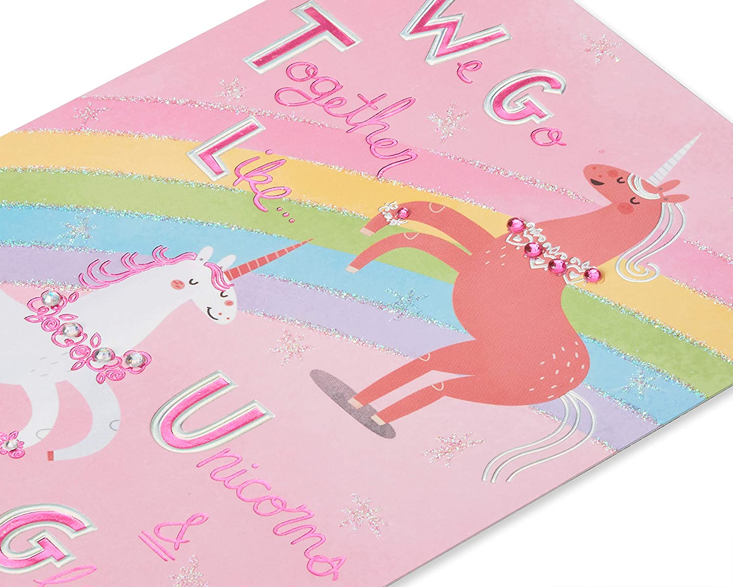 How much fun and whimsy can one card hold? For the answer look no further than this enchanting unicorn card by Papyrus. Bubblegum pink and rainbow colors are the background for two frolicking unicorns. The card that celebrates the magic of friendship is loaded with glitter, gems, embossing, and metallic foil. The inside message is bright, colorful and hand-lettered. A friendship as rare and unique as yours deserves a blinged-out card like this. Includes pink envelope with sprinkle-y print inside and gold seal. Extra postage required.
