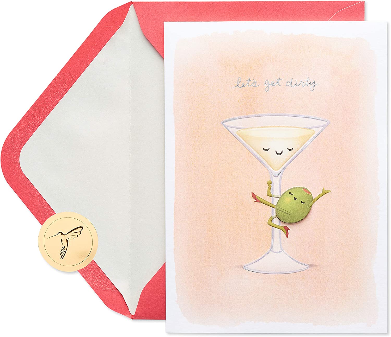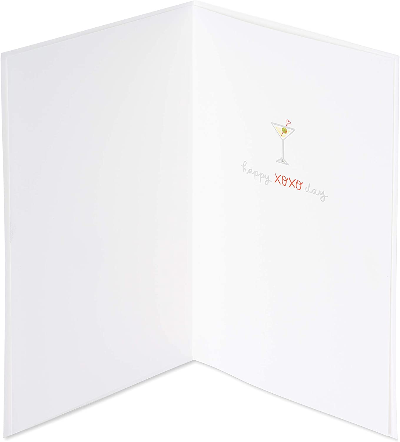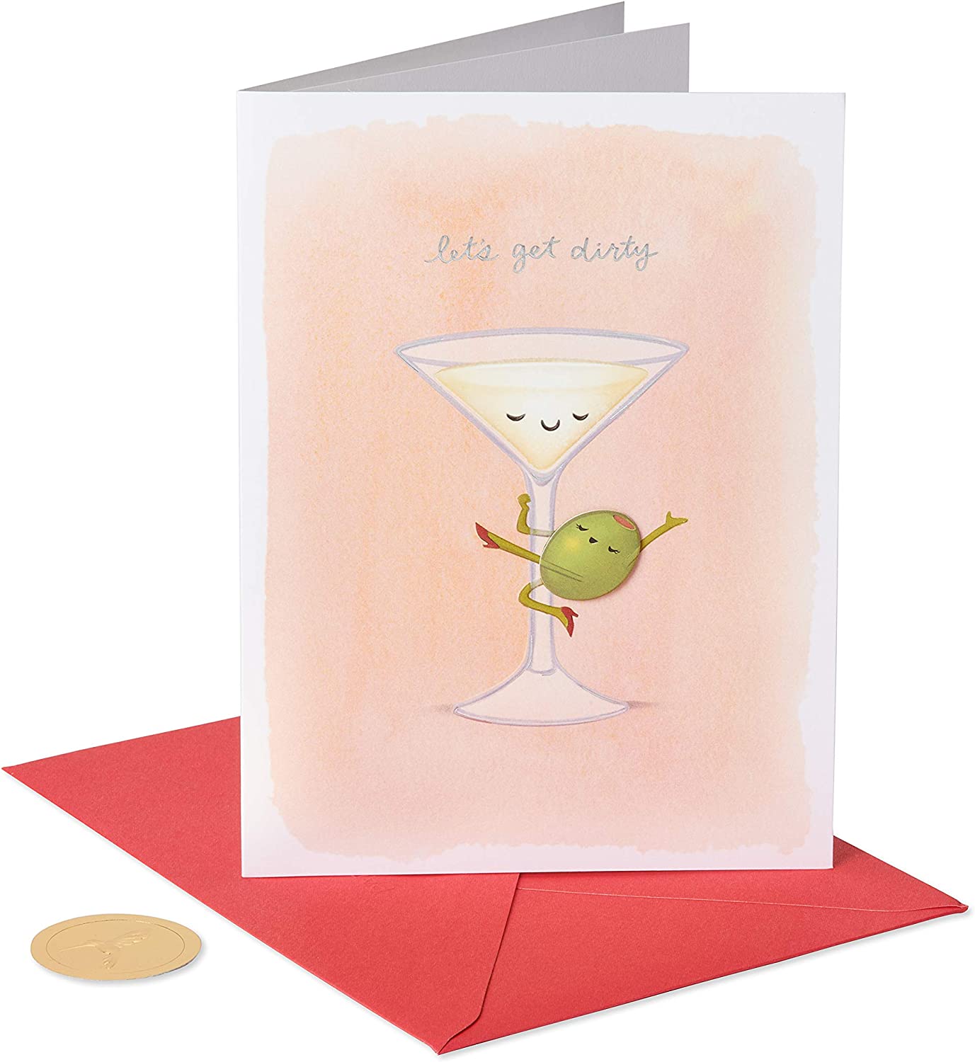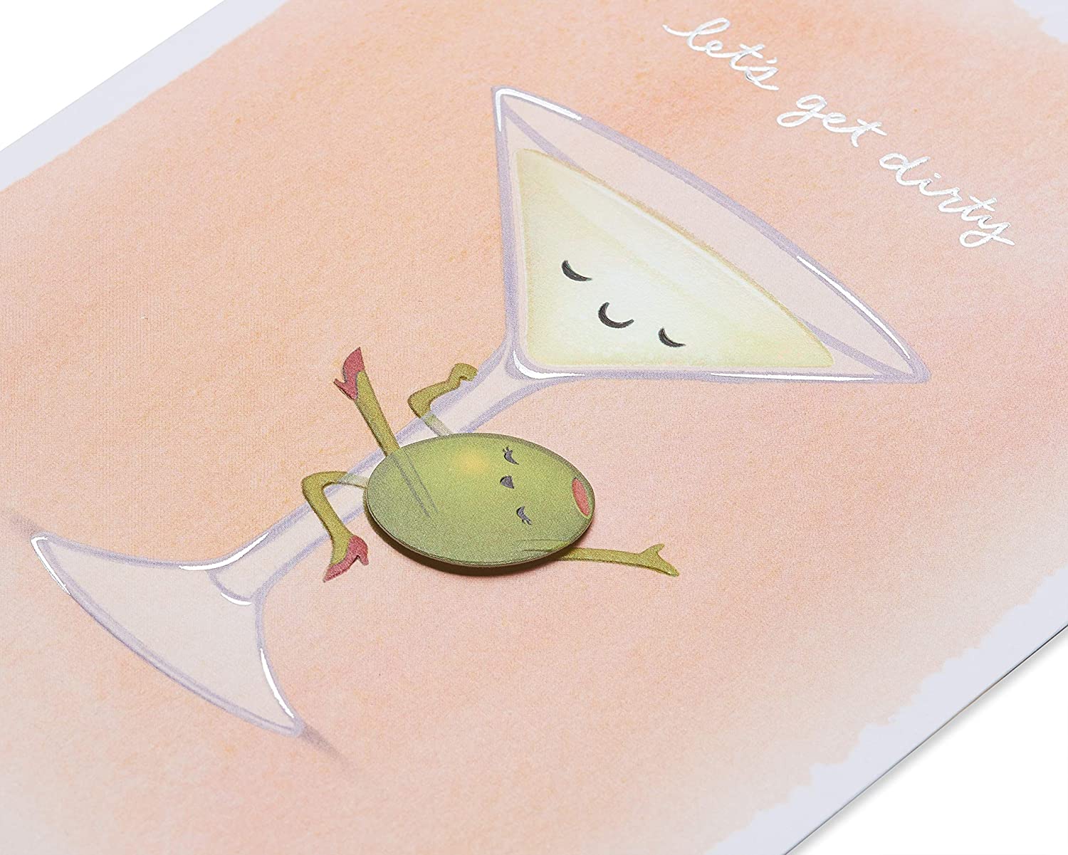 Share some playful romance with this premium Valentine's Day card from Papyrus! The adorable martini and olive couple are dancing together in this sophisticated-cute design. Copy is hand lettered to enhance the personal touch, and embellishments include gold foil and layered paper attachments. This Papyrus card gives you just the right ingredients for a perfect Valentine's Day. Cheers to love!