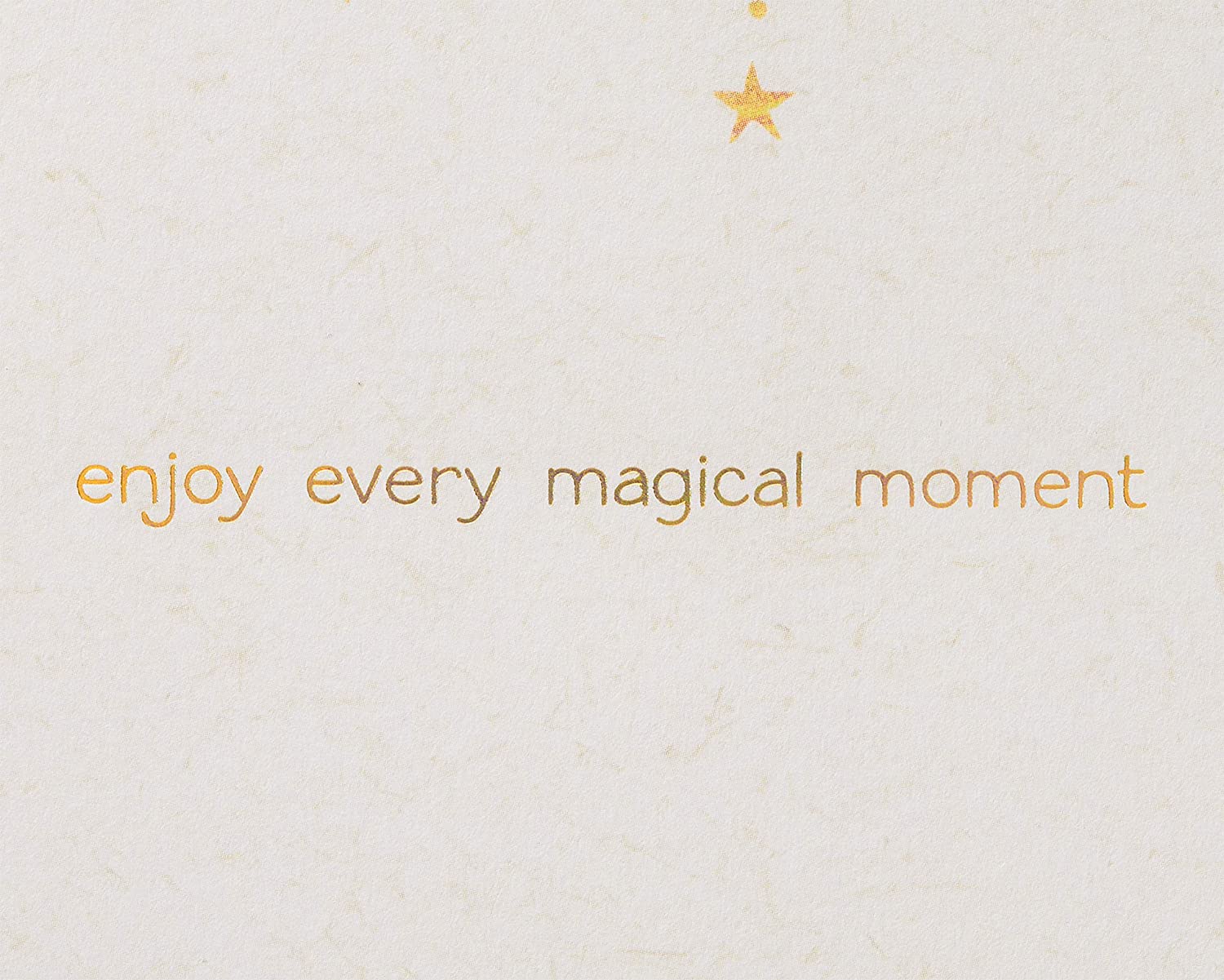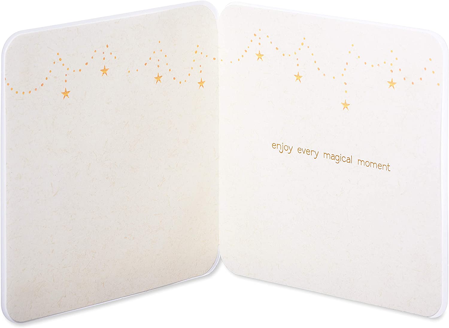Tiny miracles are the most magical of all! Celebrate the new baby with this enchanting card from Papyrus, and show the new parents that their joy means the world to you. Premium design features an adorable baby unicorn crafted in ivory felt and embellished with a tail of shimmering rainbow metallic fringe. Die-cut rounded corners on the square shape make this card extra-precious. Lettering and scattered stars are rendered in metallic gold foil. Inside message adds an extra touch of magic. Bright yellow envelope with mint green lining and unique Papyrus gold seal included. Extra postage required.