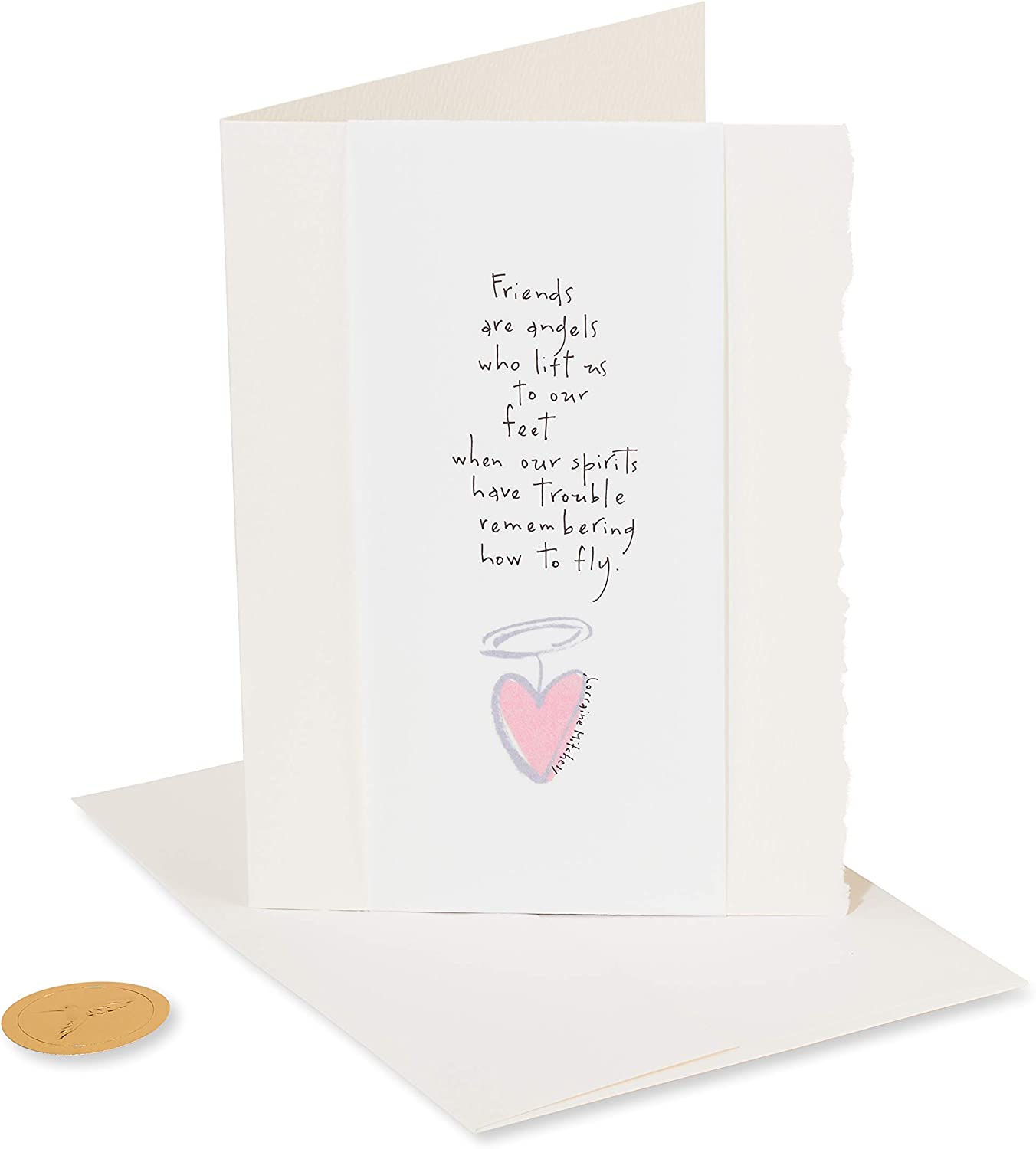 A good friend is a true gift, and this card is a beautiful reminder of that. This friendship card from Papyrus features a touching hand-written quote on premium white paper stock, with a small image of a heart with a tiny halo at the bottom of the design. Simple and sincere, this card is a perfect way to let that dear friend know how important they are to you. Left blank for you to write your own personal message, the card comes with matching white envelope and gold foil seal.