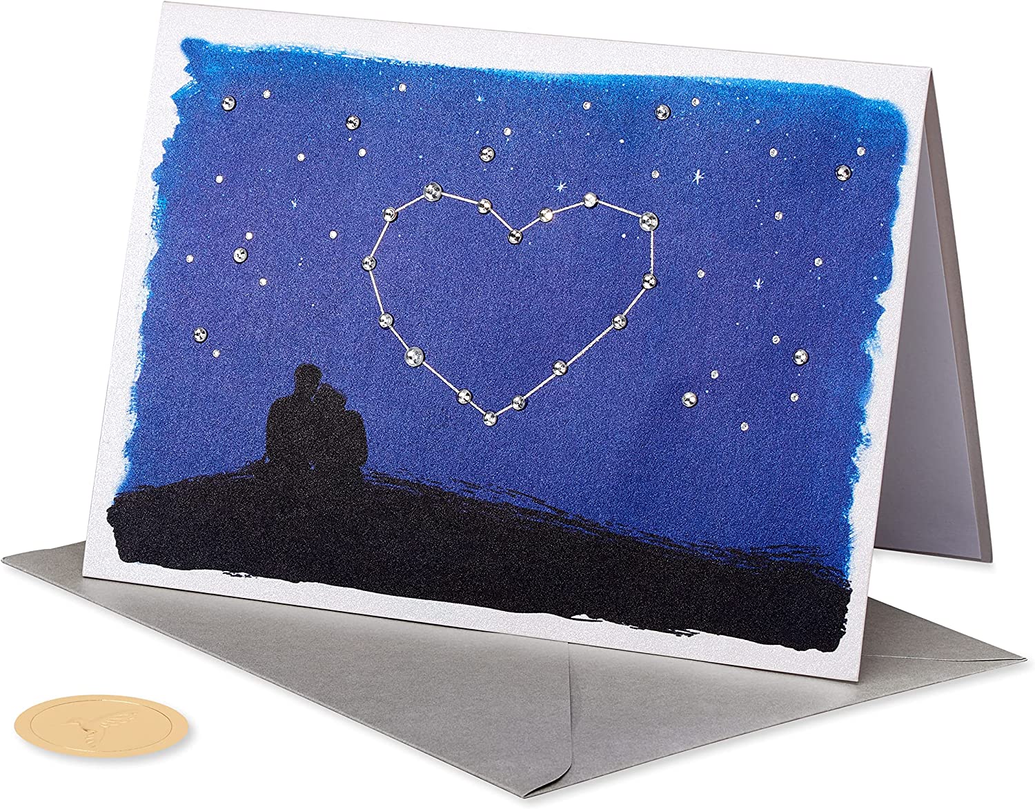 Love is in the stars--and this romantic Valentine card from Papyrus celebrates it beautifully. A shimmering night sky featuring a heart constellation is accented with gems and silver glitter for sparkle. This unique 5 x 7" card features an insert sheet with greeting printed in silver foil, and comes with a coordinating silver envelope with pearl liner, gold Papyrus hummingbird seal and a protective cello sleeve.