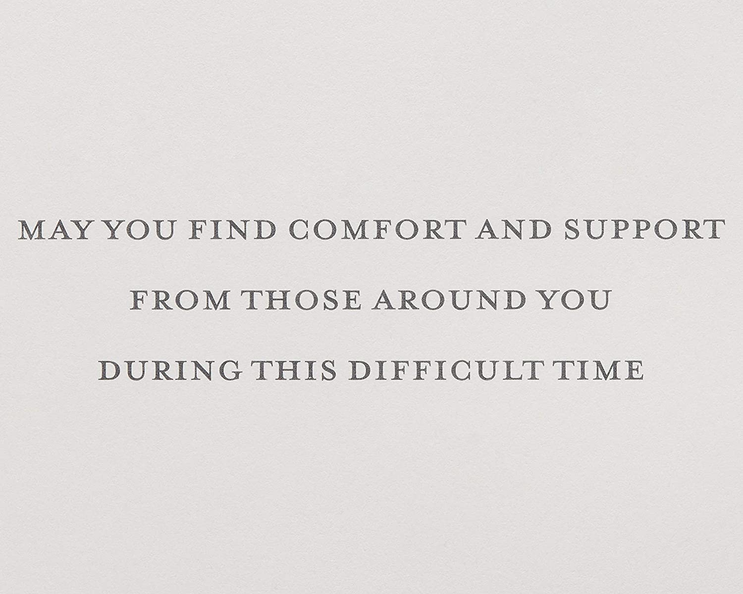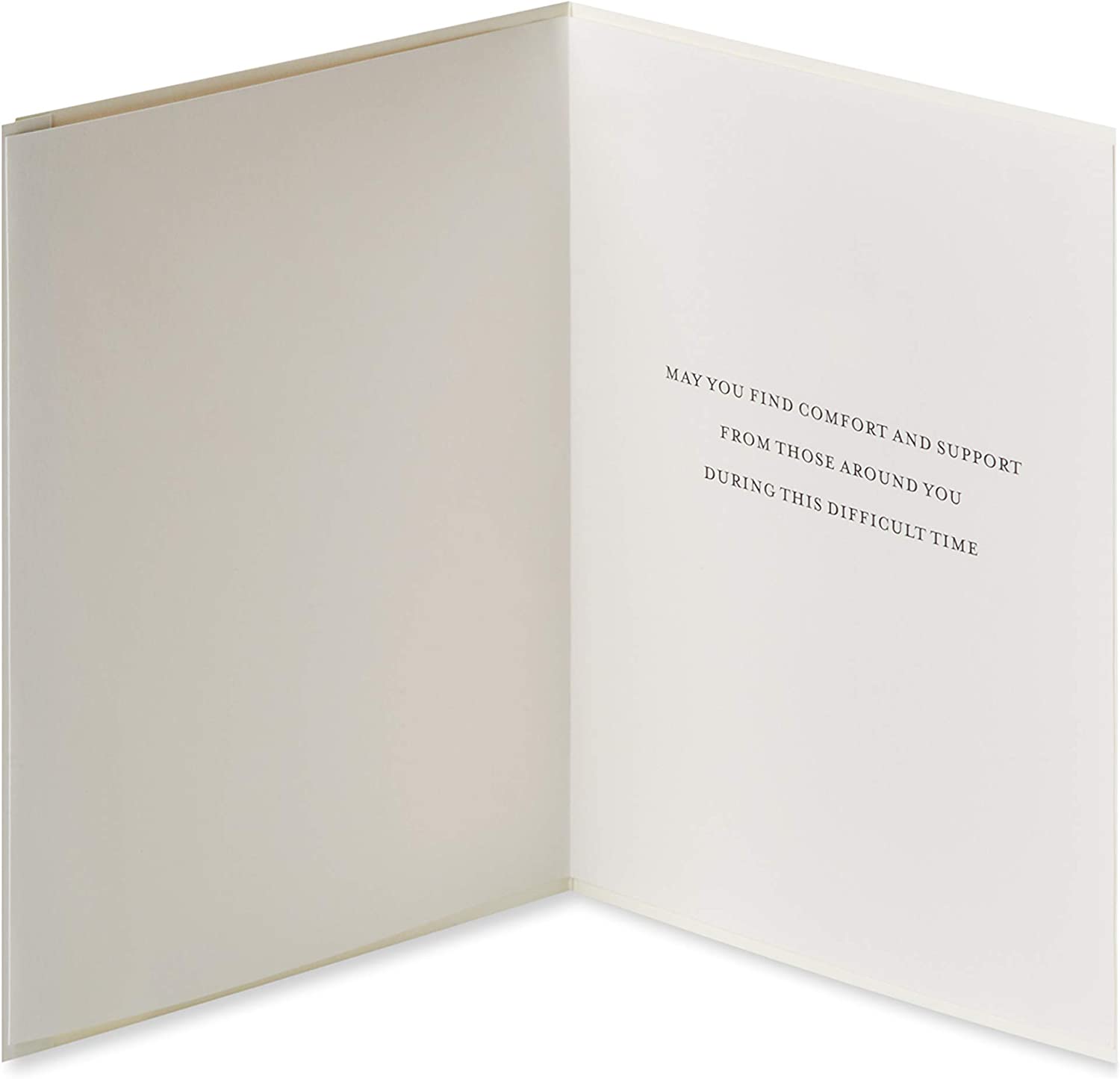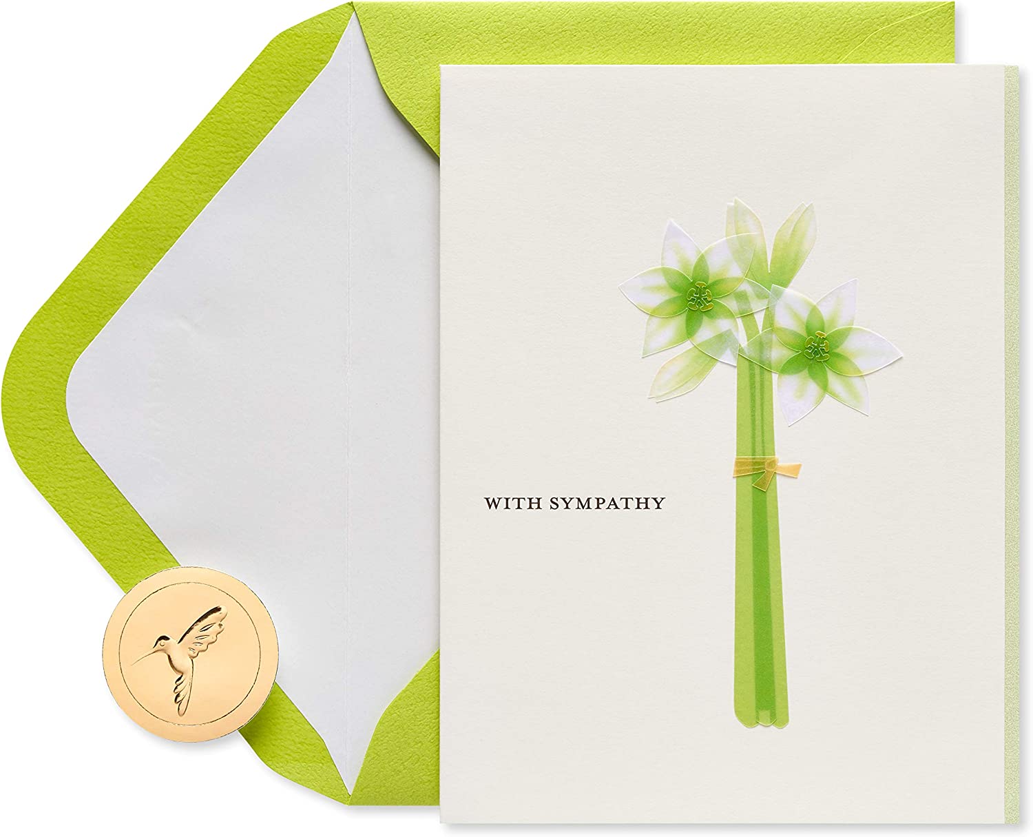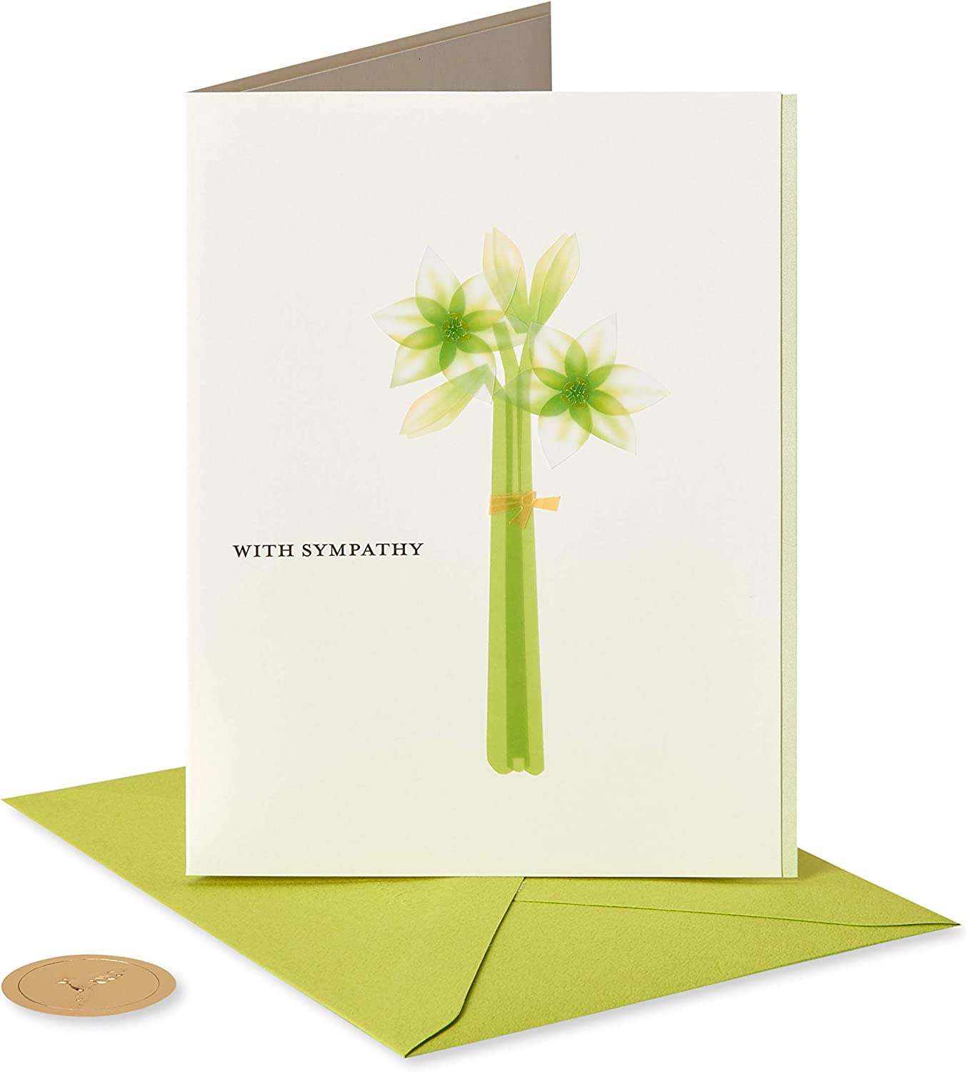 Share your sympathy and support with this premium card from Papyrus. Featuring an elegant lily design with paper attachments on the outside and a heartfelt message inside, it will bring some comfort and show how much you truly care. Includes a green envelope with silver lining and the one-of-a-kind Papyrus gold seal.