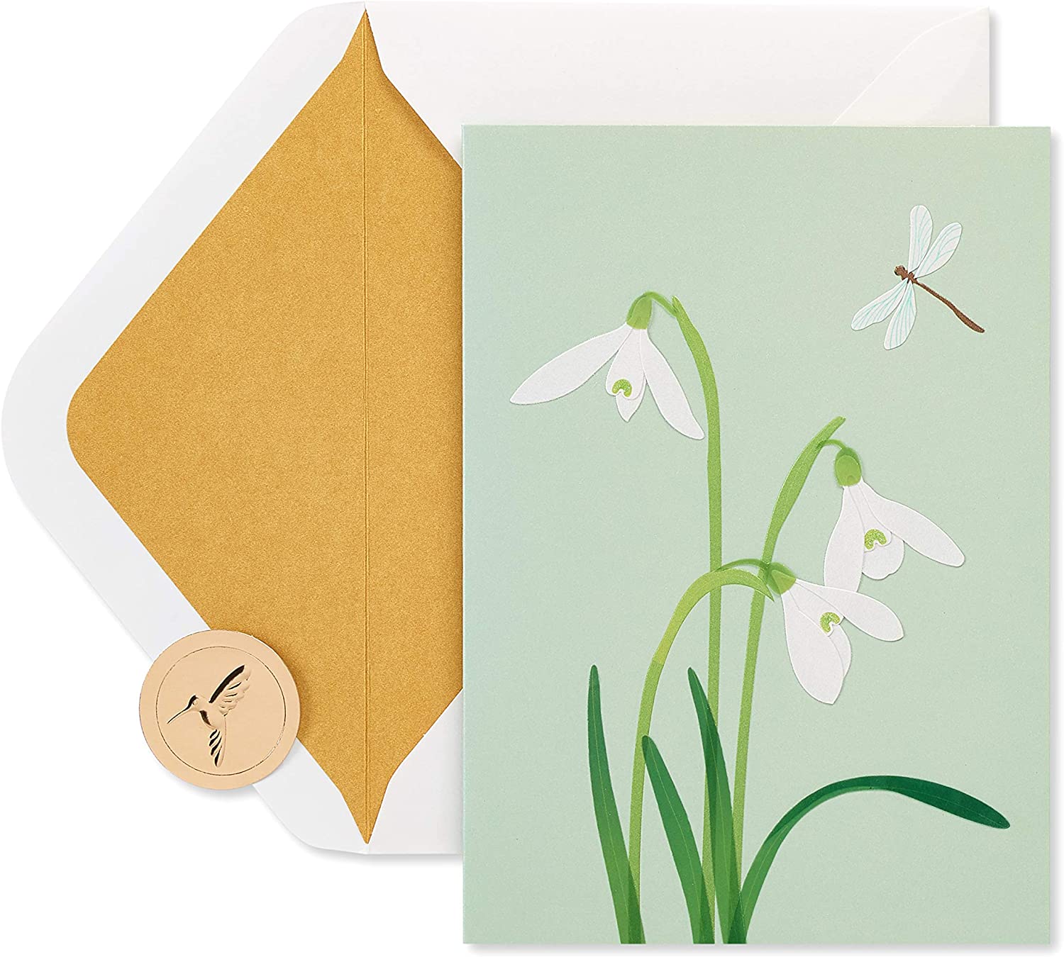 Let them know you care with this comforting hand-crafted Sympathy card only from Papyrus. The unconventional design features a stylized image of a dragonfly amidst white crocuses in a soft mint and green color palette. Constructed by hand using premium paper stock, with a simple inside message and matching envelope with golden yellow insert. Gold foil seal included.