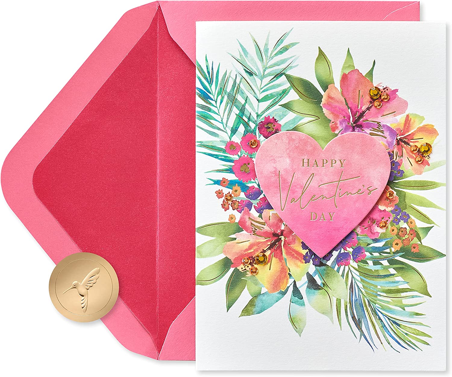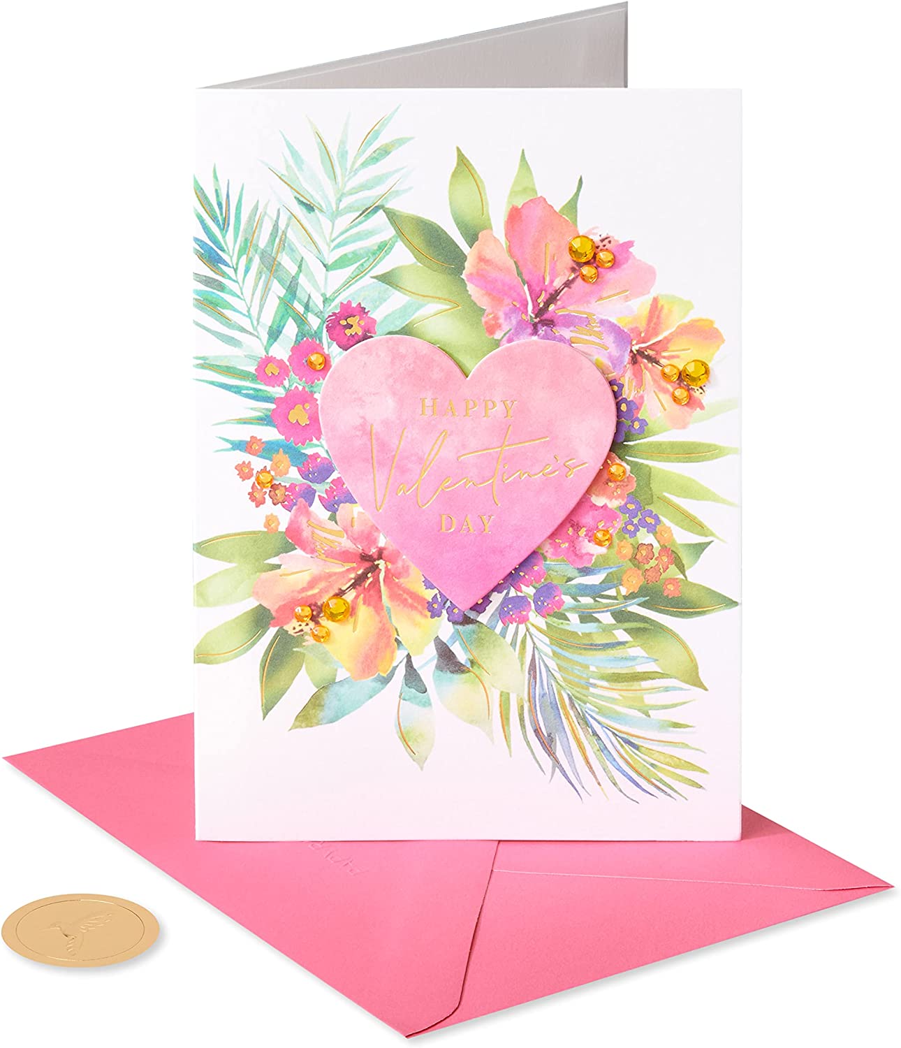 Make someone feel extra loved on Valentine's Day with a premium card like this one from Papyrus. The front features a beautifully painted heart with tropical flowers and gold foil lettering as well as gem and paper attachments. Inside includes a warm and touching message of gratitude that will bring joy to whoever receives it. Premium pink envelope and gold seal included.