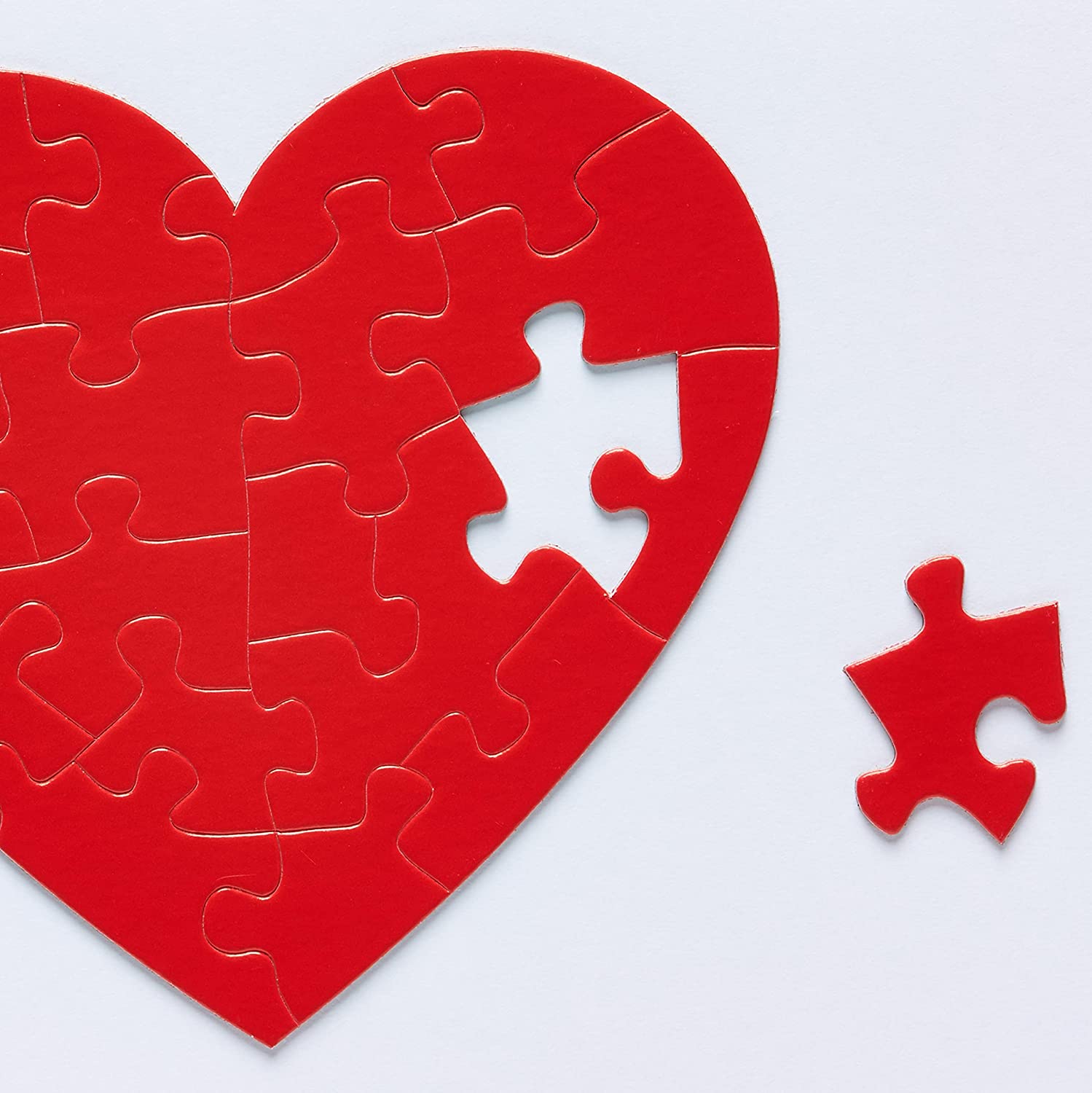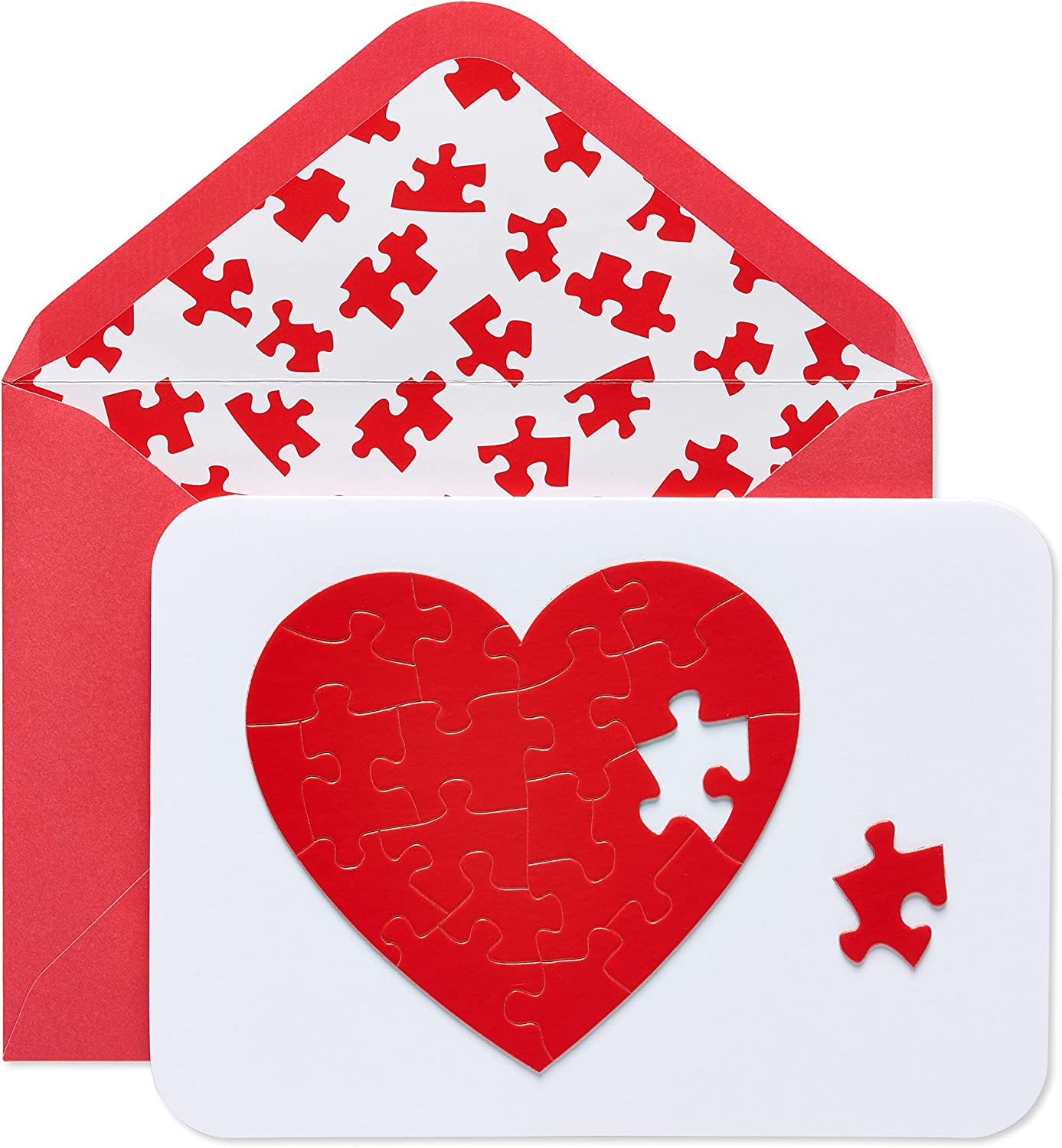 This romantic Valentine card from Papyrus features a heart shaped puzzle with the inside message of "You complete me." Bold and eye-catching handmade 5 x 7" Papyrus card features a red insert sheet with greeting in white. Comes with a coordinating red envelope with puzzle pattern on the border and liner, gold Papyrus hummingbird seal and a protective cello sleeve.