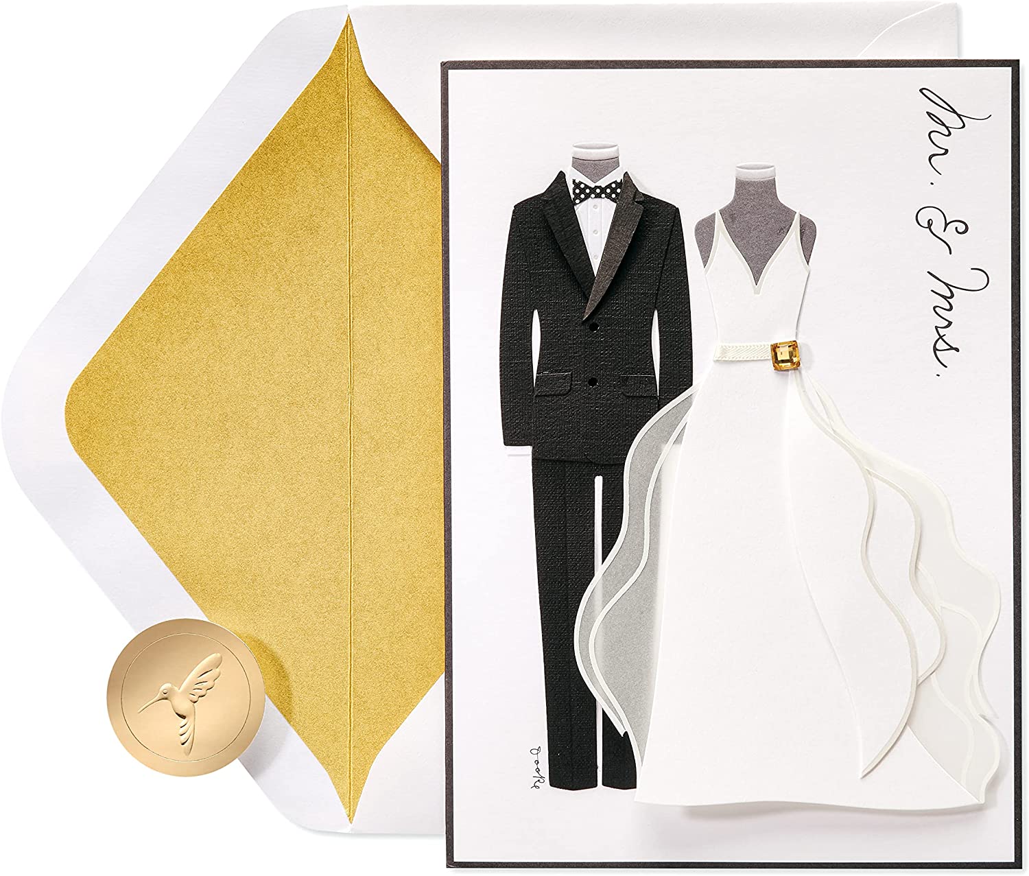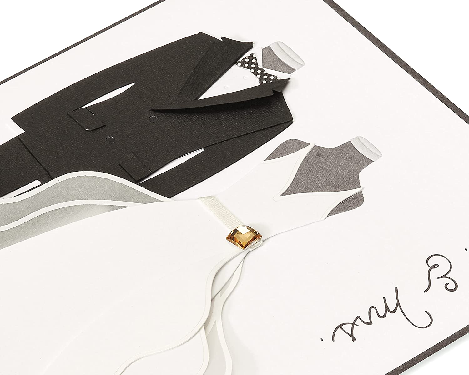 Congratulate the happy couple with this elegant wedding card exclusively from Papyrus. Featuring a beautiful handmade design of bride and groom mannequins on premium paper stock with layered paper attachments, gems, ribbons, and metallic foil accents, this is a card so many couples would love. Inside, sweet compliments to the happy couple as well as warm wishes for the future. A matching envelope and classic gold foil Papyrus seal are also included. Extra postage required.