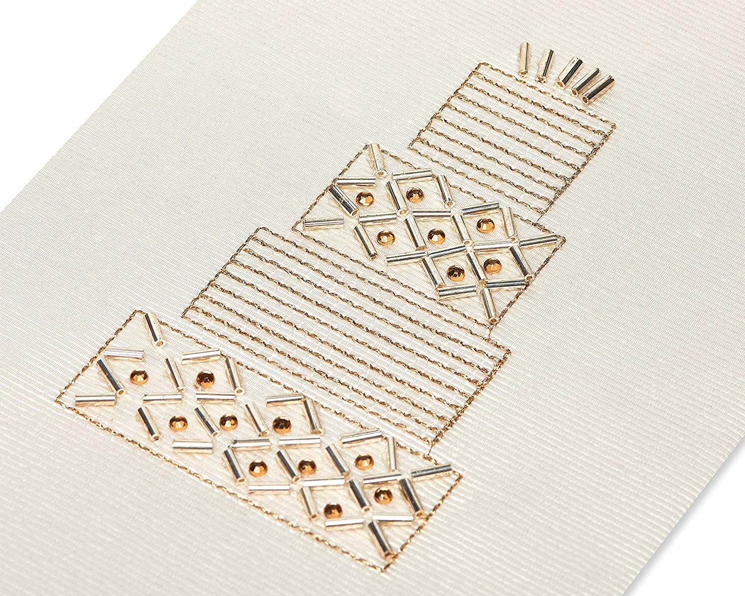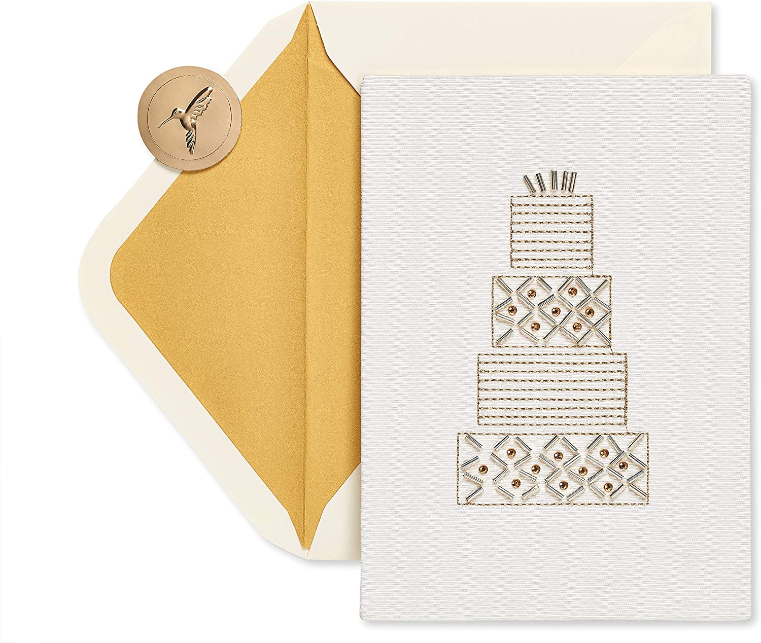 There's no better way to celebrate "The Big Day" than with a beautiful Wedding card from Papyrus! This simple yet sophisticated design features a modern wedding cake, embellished in foil, glitter, gems and metallic beads on white textured fabric. Papyrus offers premium stationery, greetings cards, gift wrap, gift bags and entertaining products for everyday occasions and all holiday seasons--all with unique designs and quality embellishments.