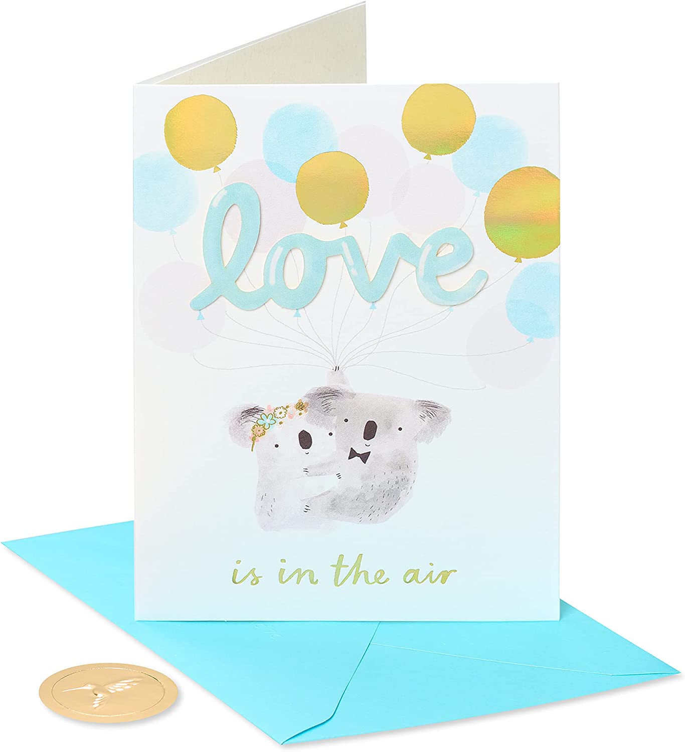 You'll send the happy couple's spirits soaring with this delightful premium Wedding card from Papyrus. Design features two cute koala bears wrapped in an embrace and holding onto balloons. The design is made even sweeter with the outside message that reads, "Love is in the Air." Embellished with foil and paper attachments, this card is the perfect way to celebrate the happy couple. The inside message offers a heartfelt wish that will start their marriage journey in the right direction. Help make their special day even more special! Premium envelope with unique Papyrus gold seal included. Extra postage required.