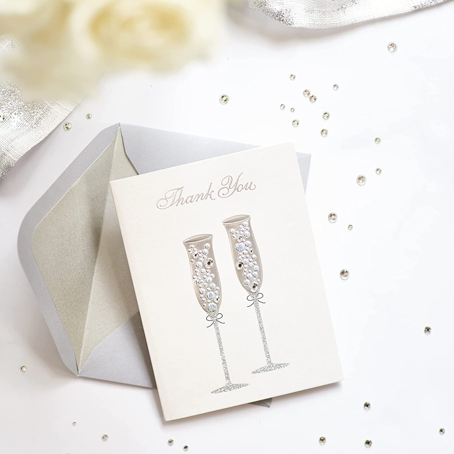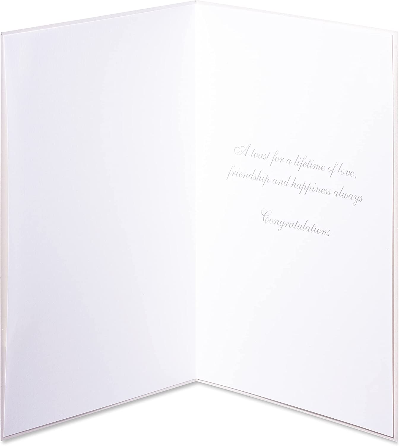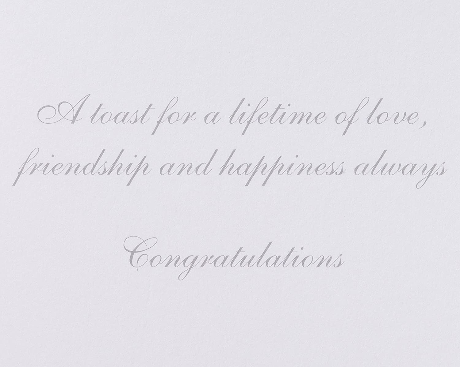 Delight a bride and groom with this premium Wedding Congratulations card from Papyrus. Gems inside the champagne flutes add so much sparkle to the bubbly that you can practically feel the fizz beneath your nose. The design is complemented by lettering in elegant silver script and an inside message wishing the happy couple a lifetime of love. A silver envelope is included, as is the signature Papyrus gold seal.